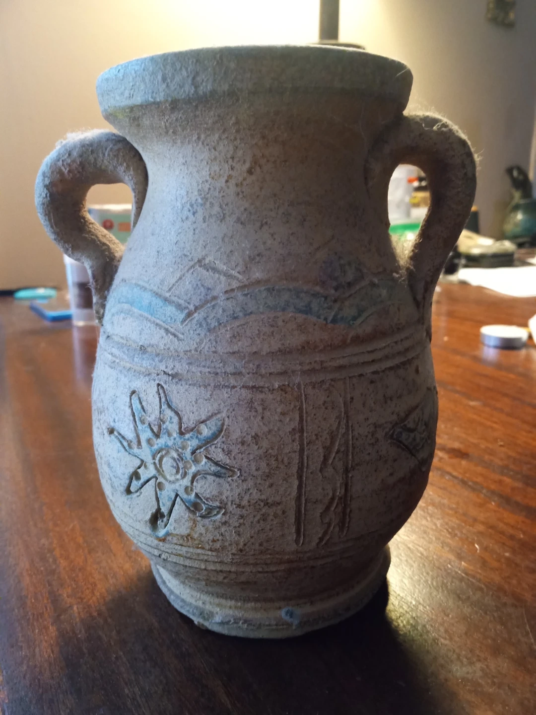 A textured ceramic vase with a rustic, aged finish. It features raised decorative elements including fish and starburst patterns. This decorative piece would look great on a shelf or mantelpiece.