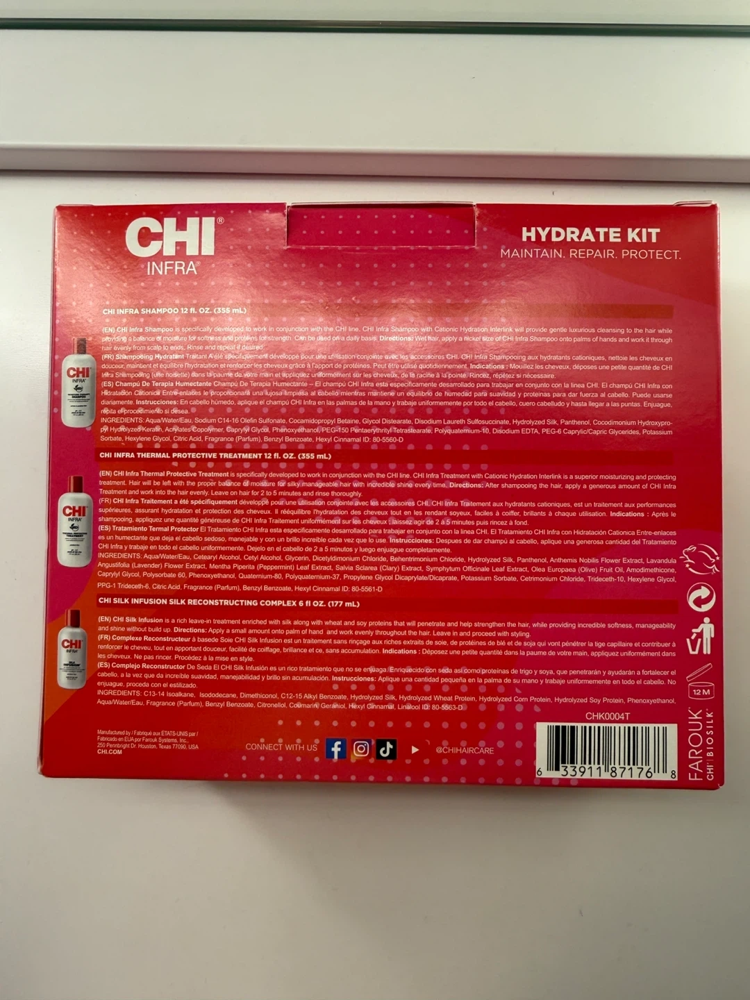 This CHI Infra Hydrate Kit includes Moisture Therapy Shampoo (12 fl. oz. / 355 mL), Silk Infusion (6 fl. oz. / 177 mL), and Thermal Protective Treatment (12 fl. oz. / 355 mL). All products are sulfate and paraben free. Made in the USA. Brand new in box.