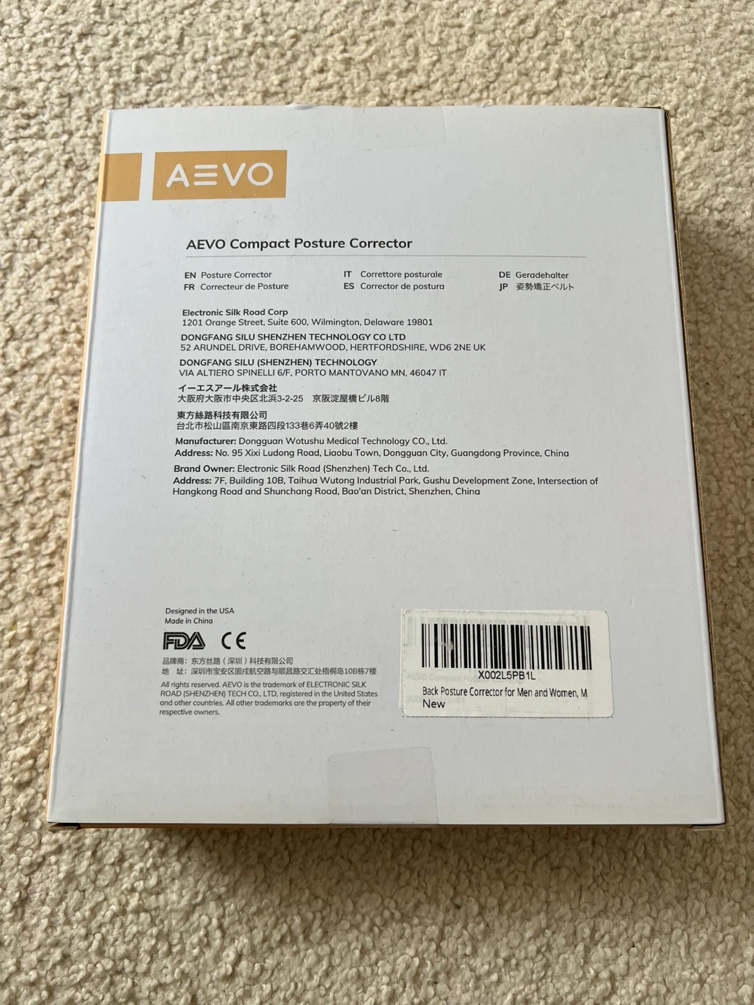 AEVO posture corrector, size medium. Includes user manual. Made with a durable material for comfortable support. Great for improving back alignment!