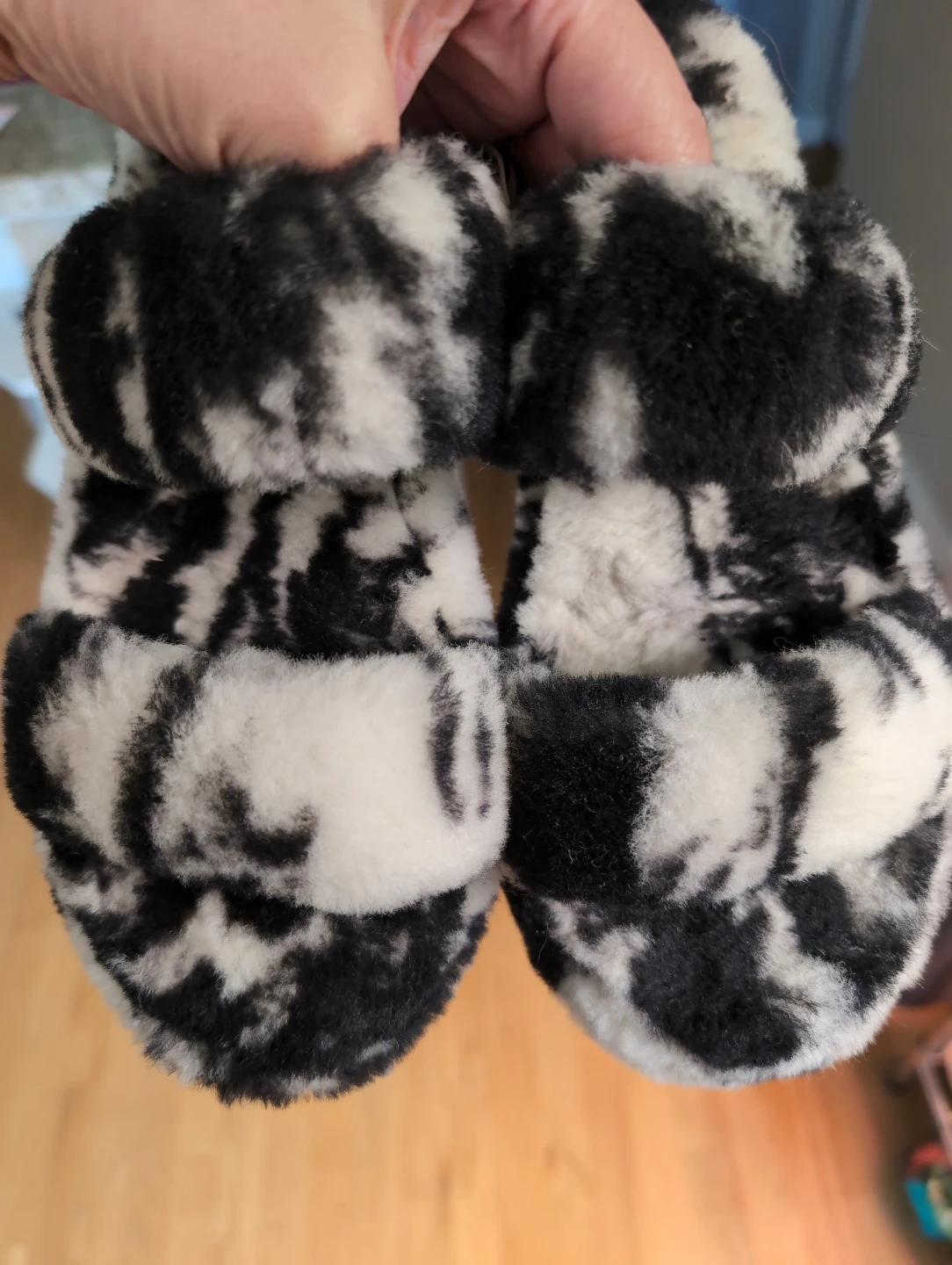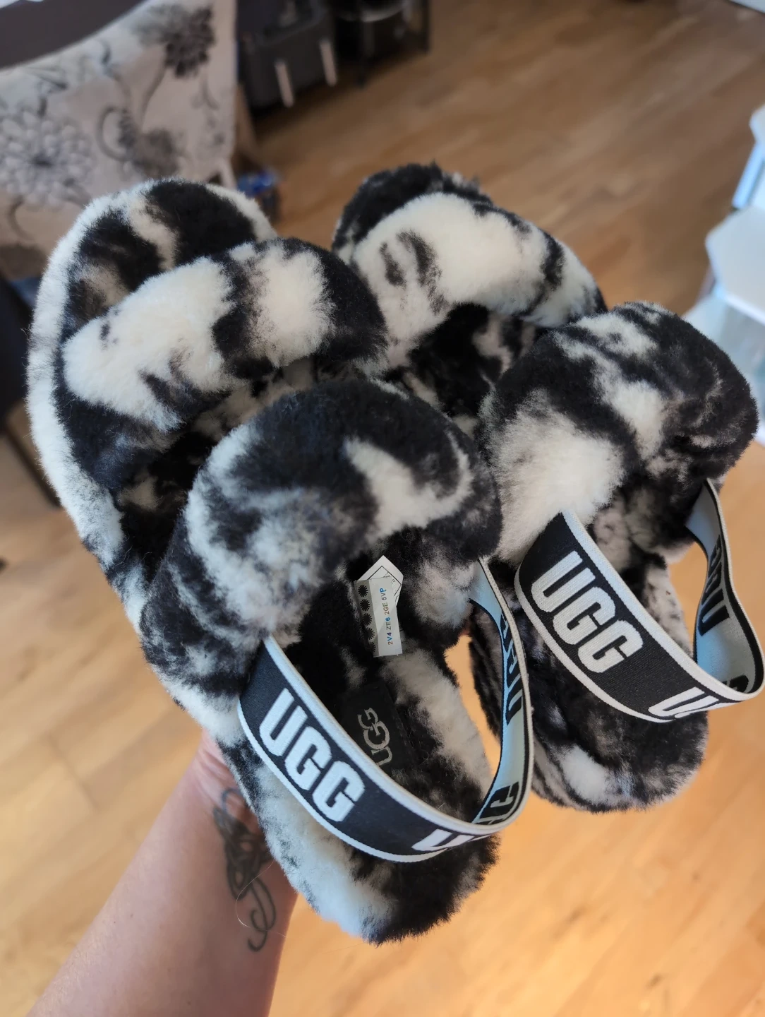 Comfy Ugg Fluff Yeah slide slippers in a black and white tie-dye pattern. Like new, only worn a couple times.