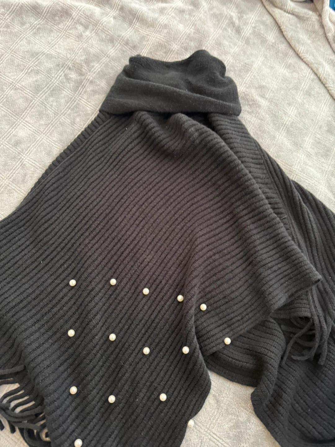 Cozy black knit poncho featuring a stylish cowl neck and fringed hem. It's embellished with scattered faux pearls for a touch of elegance. I got it from urban planet but I've not had the opportunity to wear it