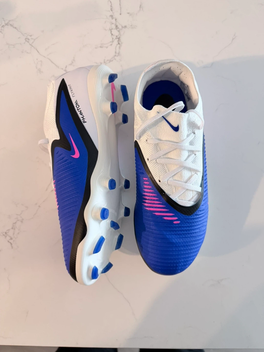 cleats come in a vibrant blue, white, and pink colourway. They're designed for performance on the field. The Flyknit construction offers a snug, sock-like fit.
