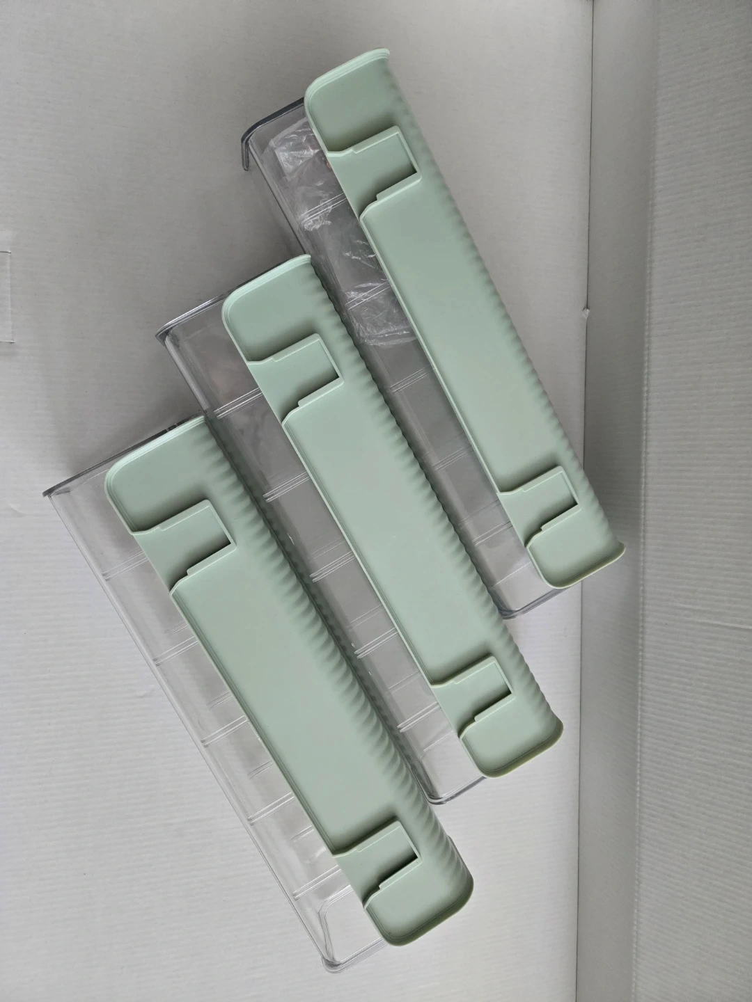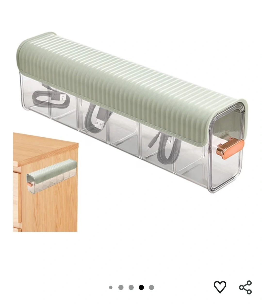 This is a clear storage organizer box with a light green lid and a rose gold handle. It has four individual compartments, perfect for organizing small items like socks, ties, or cables. The compact design makes it suitable for drawers or shelves. It's great for keeping your space tidy!