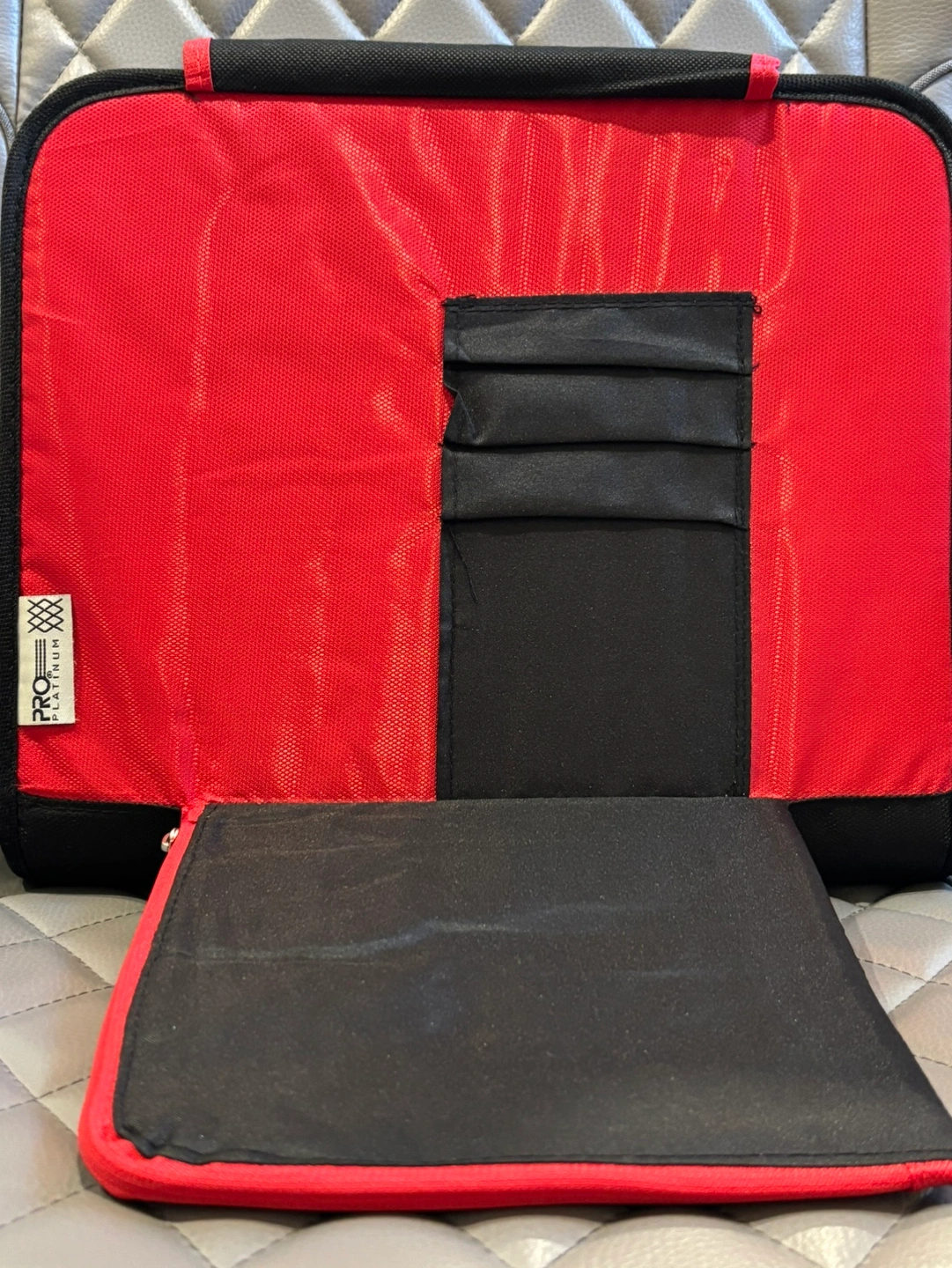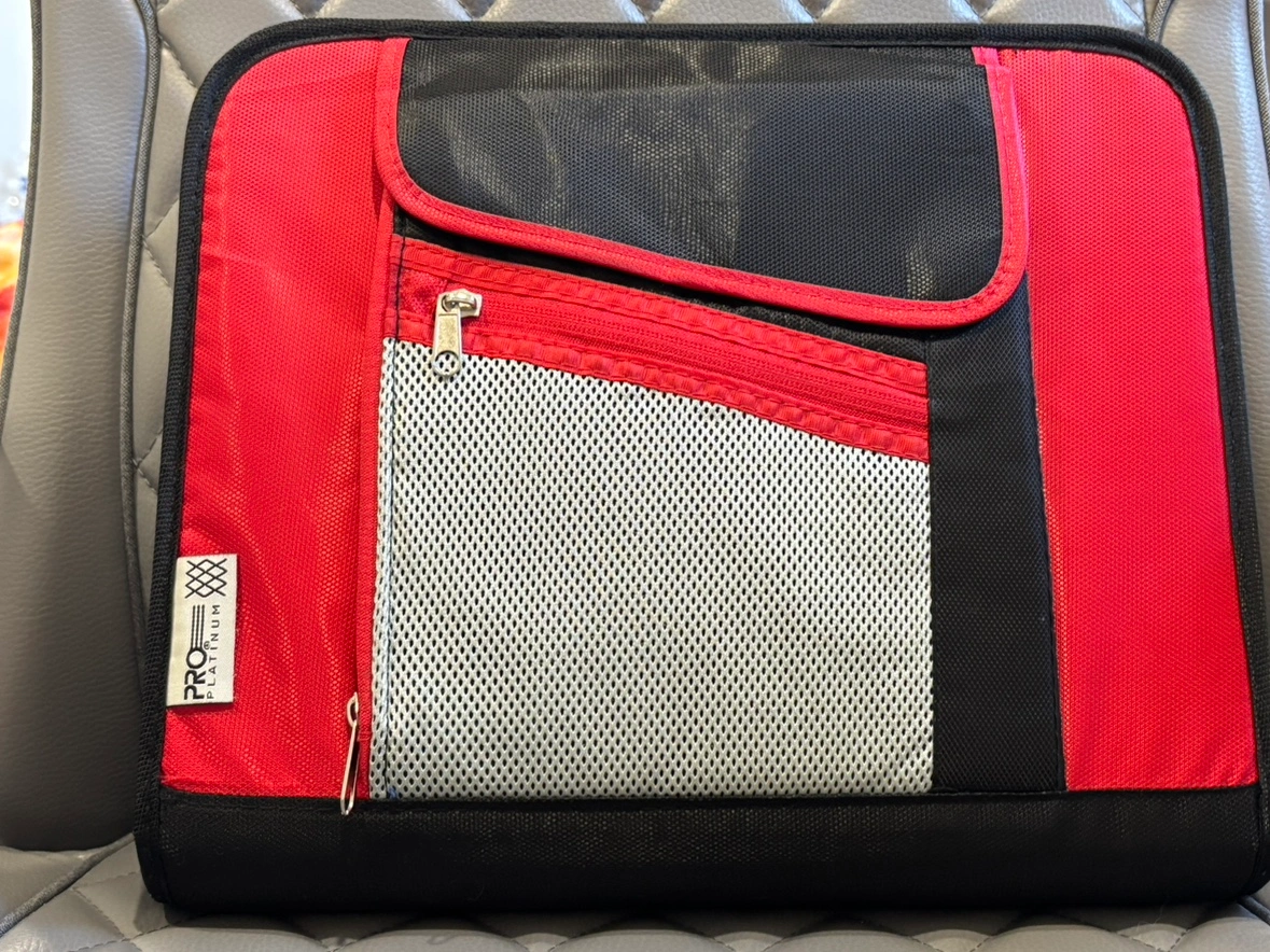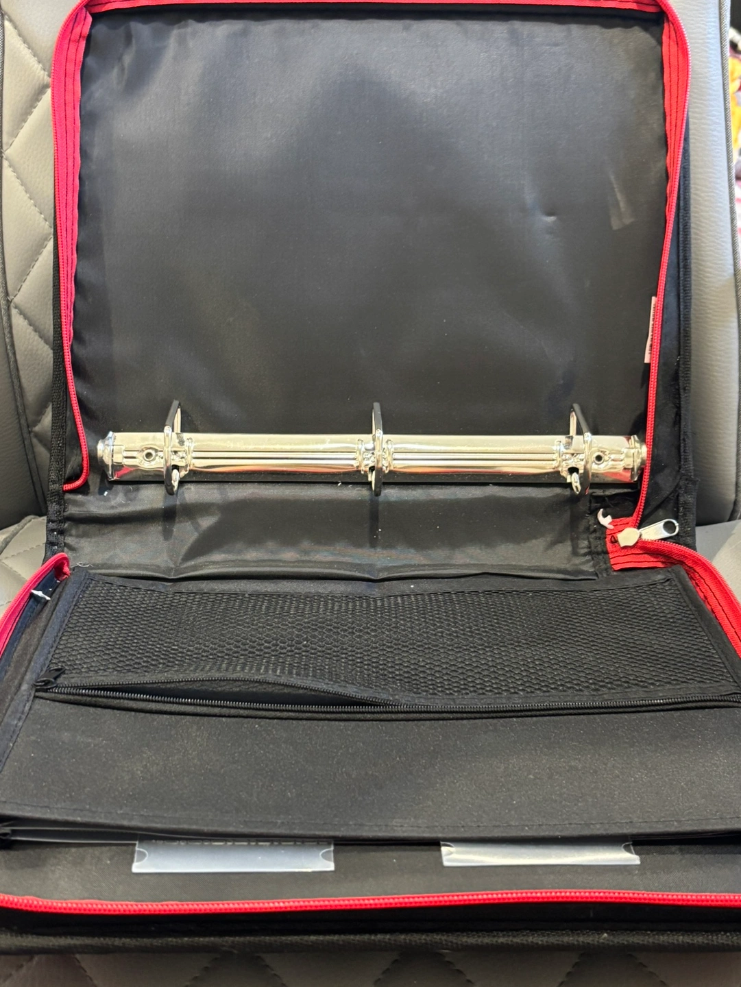 This binder has multiple pockets and a zipper closure. It is the perfect size to keep all of your important documents in order. It comes with a zippered pocket on the outside and a zippered pocket on the inside. It also has a mesh pocket and a spot for pens on the inside. The binder has 3 rings.