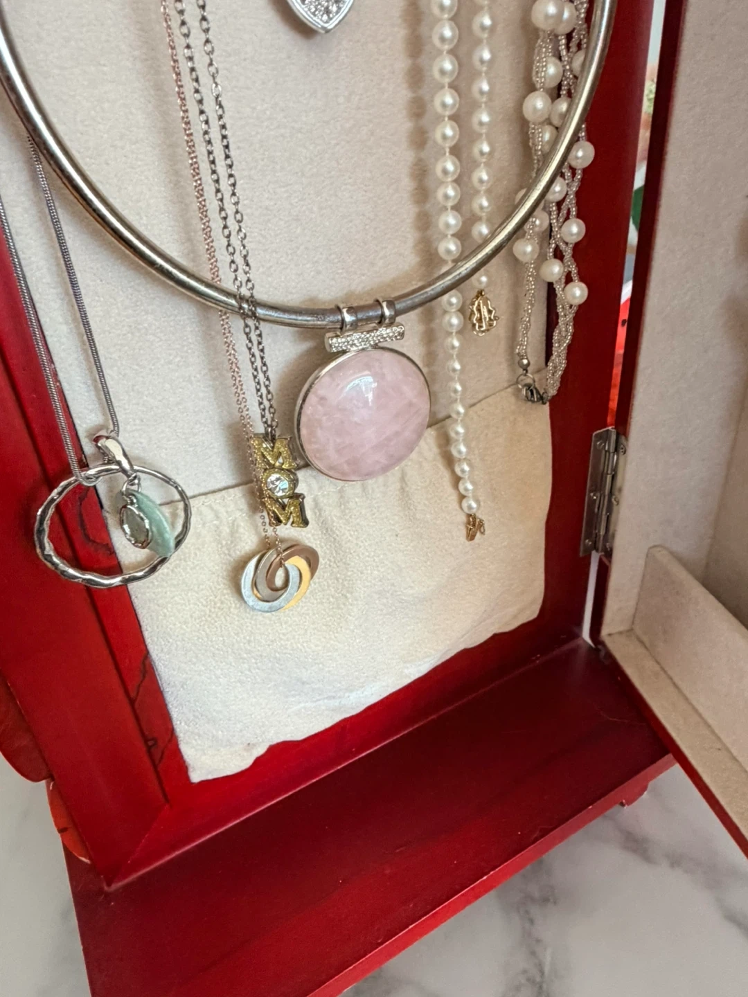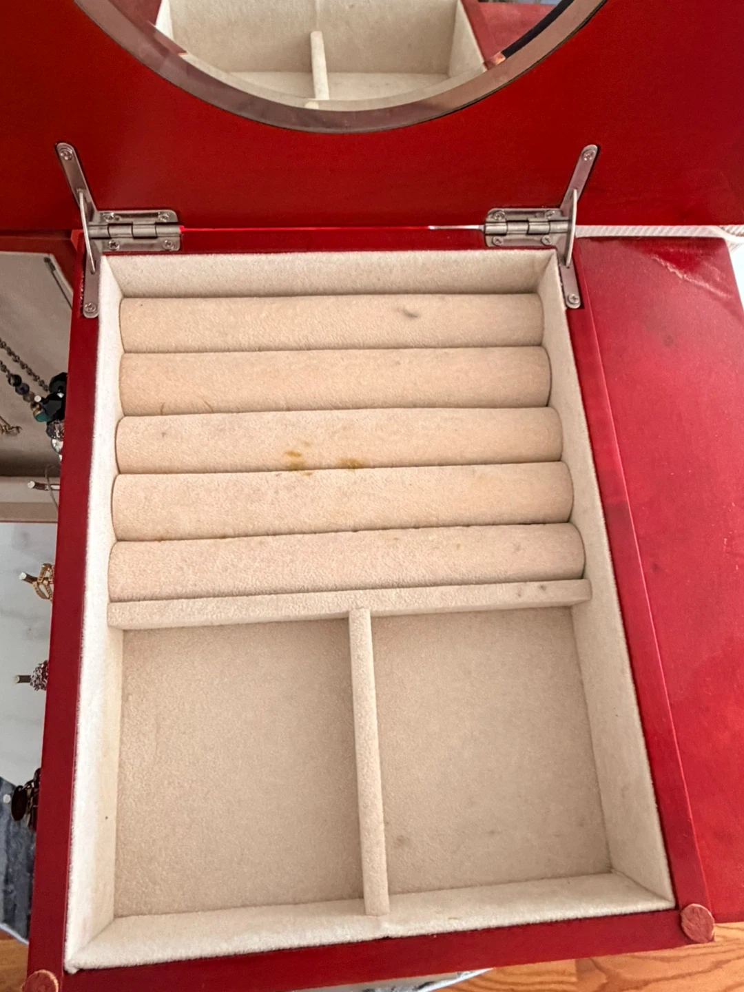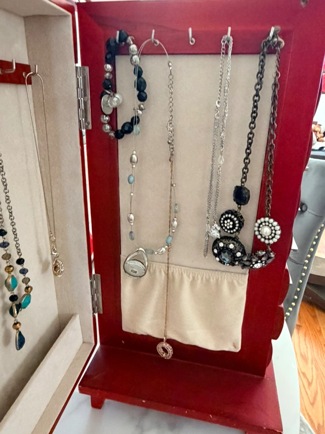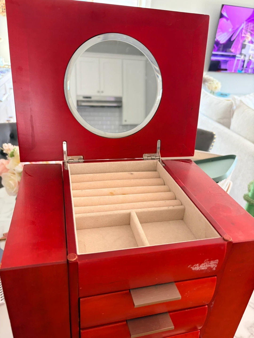 Red wooden jewelry box featuring seven drawers for storage and organization. It has a hinged door that opens to reveal necklace hooks and additional compartments. This box is perfect for keeping your jewelry collection tidy and accessible!