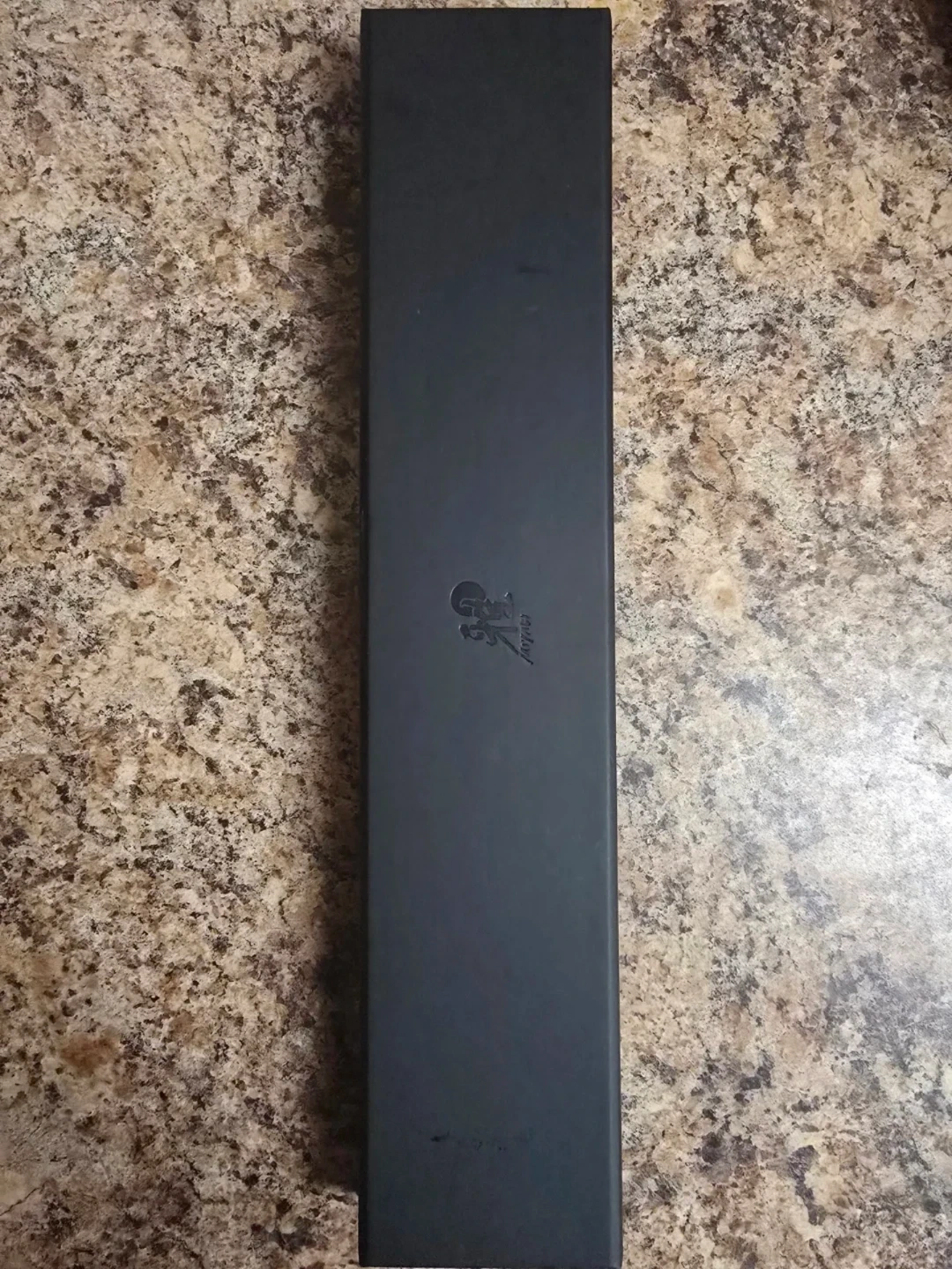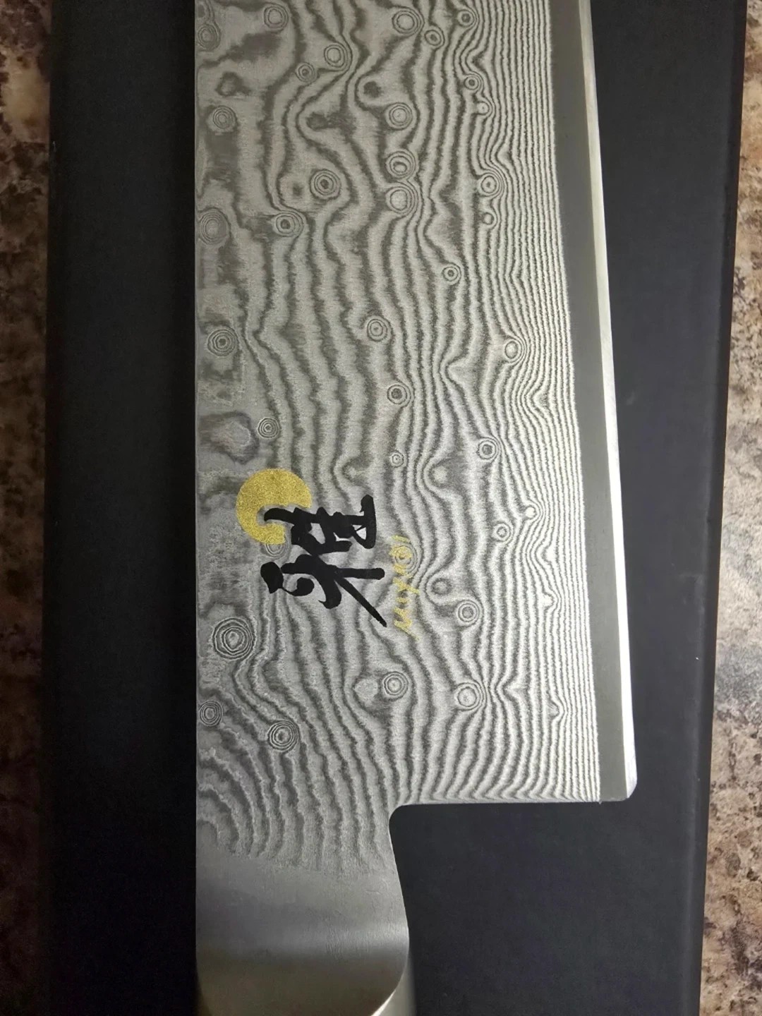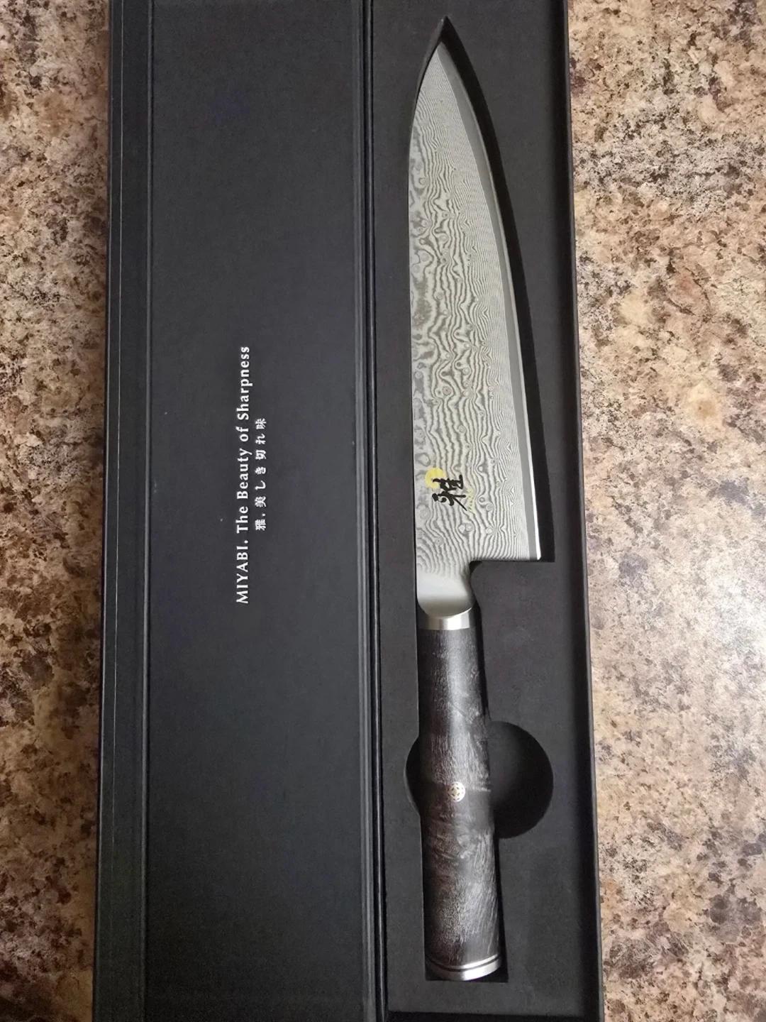 Miyabi Black 5000MCD67 chef's knife with a Damascus pattern. 8-inch blade made of Micro-Carbide steel. Very lightly used. Includes original box.