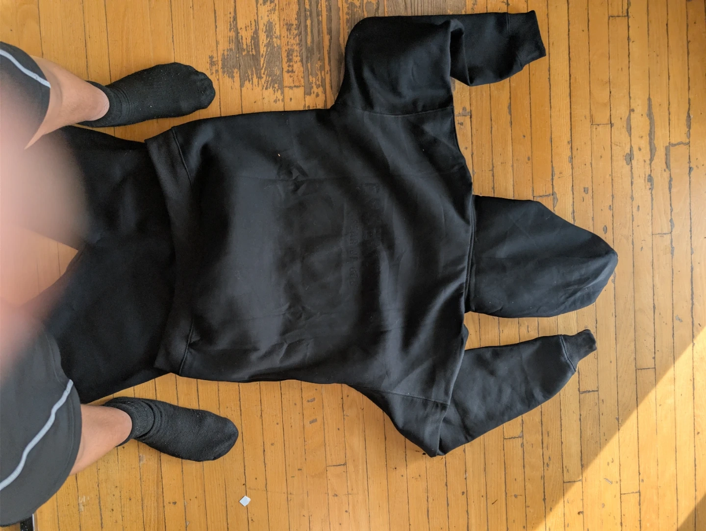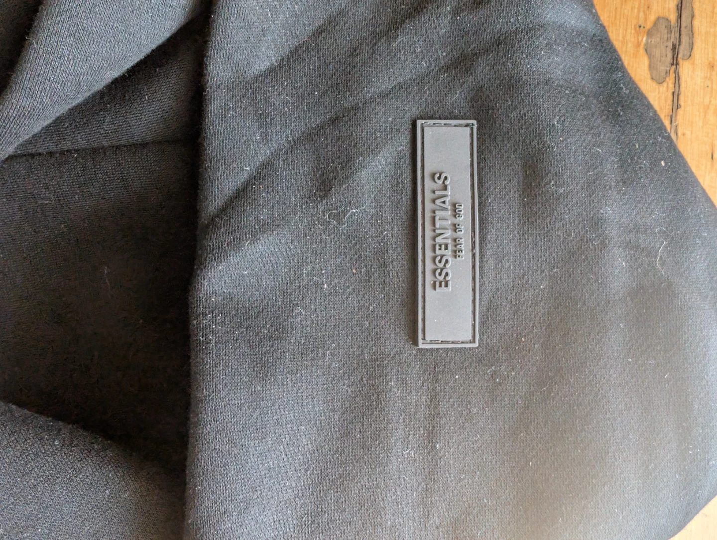 This is a black Fear of God Essentials hoodie and sweatpants set. The set is made from a comfortable fabric. It's perfect for casual wear.