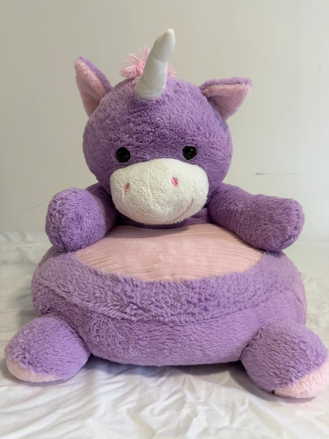 This adorable purple plush unicorn seat is super soft and cuddly! It's perfect for a little one's room. Made with fuzzy polyester material.