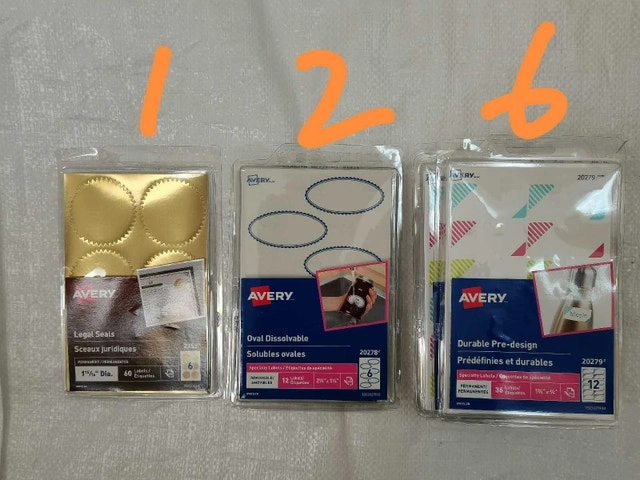 I'm offering three sets of Avery labels, perfect for adding a professional touch to your projects or organizing your documents. These labels are new and ready to use, ensuring crisp, clear results for all your labeling needs. Total 1 legal seals, 2 oval dissolvable labels, and 6 durable pre-design labels. Pickup near NW end.