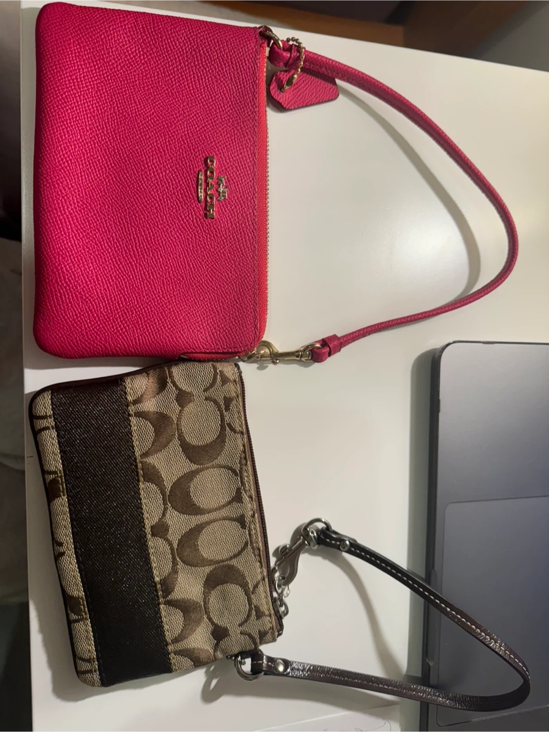 Two Coach wristlets for sale! One is a vibrant pink and the other features the classic Coach logo pattern in brown tones. Perfect for carrying your essentials in style