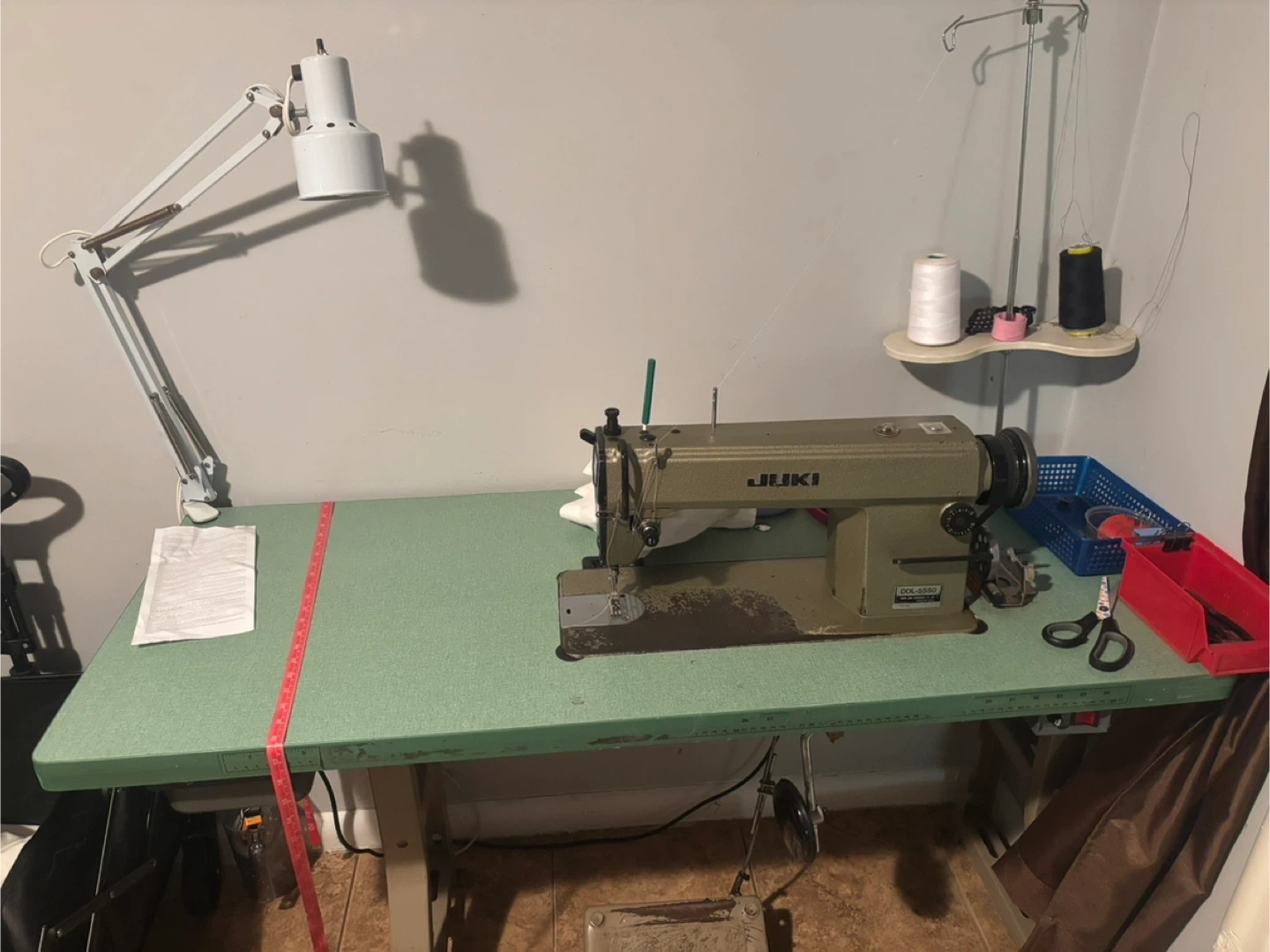 This is a Juki DDL-5550 industrial sewing machine. It's a reliable machine for various sewing tasks. It comes with a table, lamp, and thread supplies.