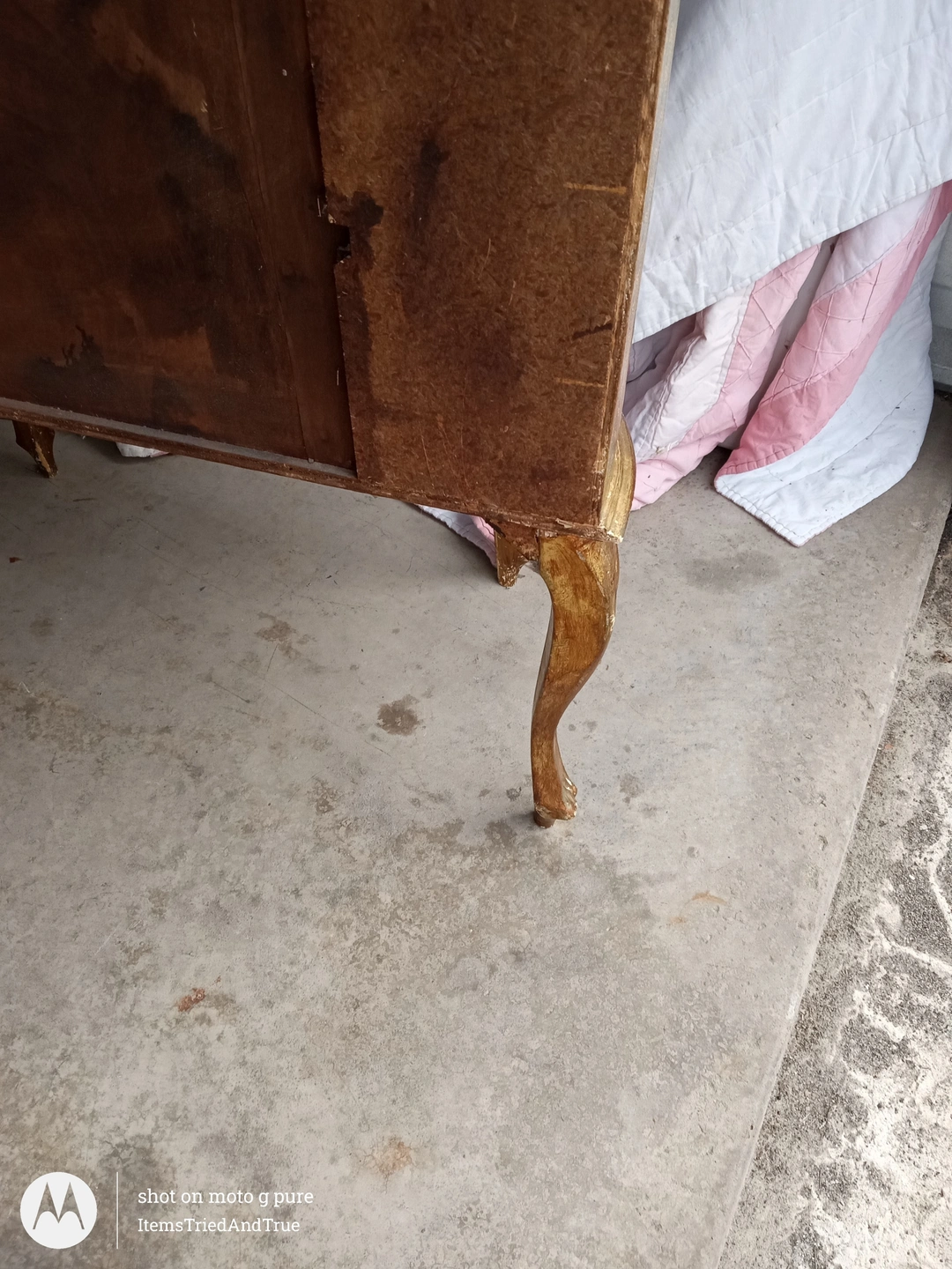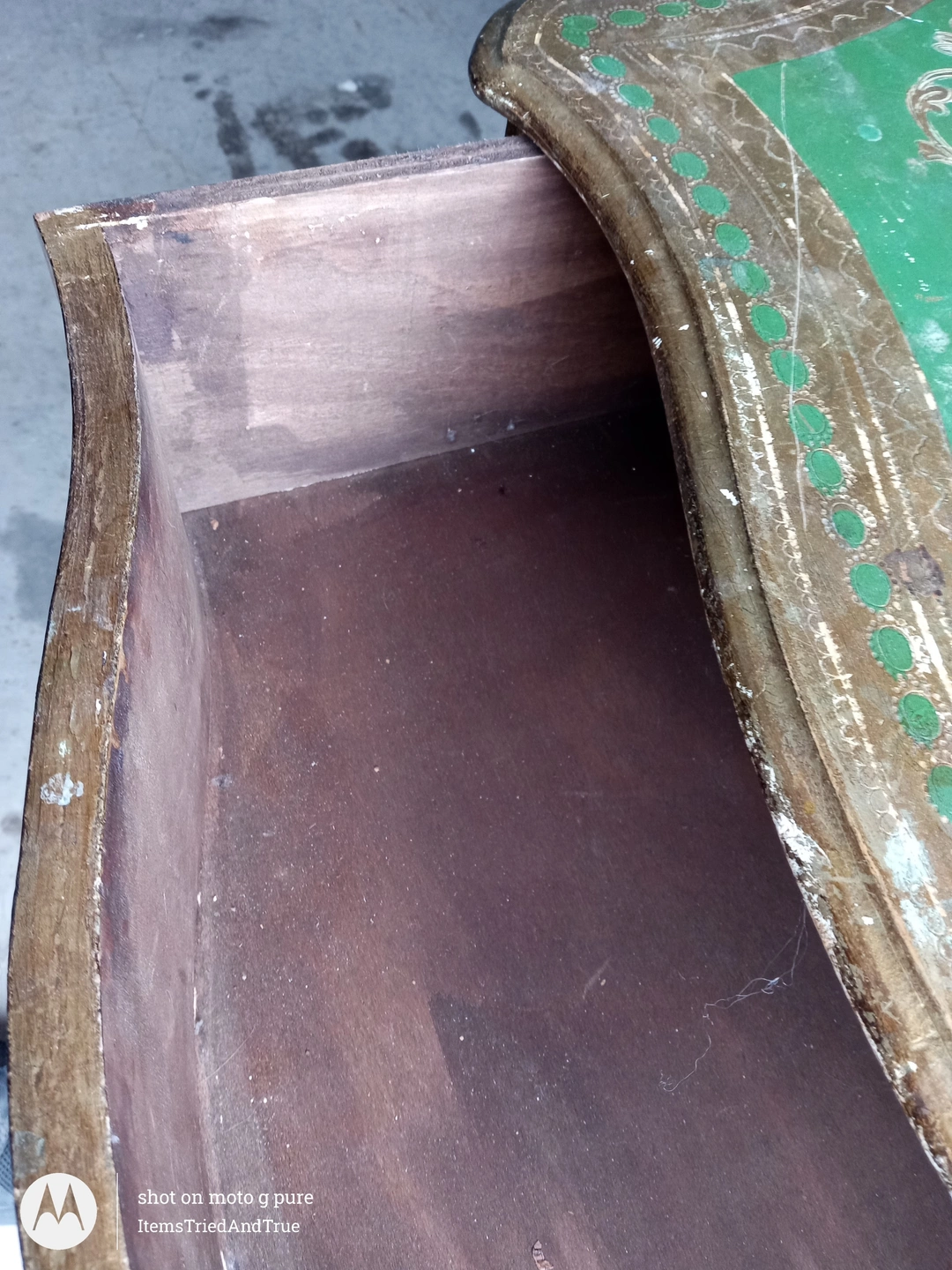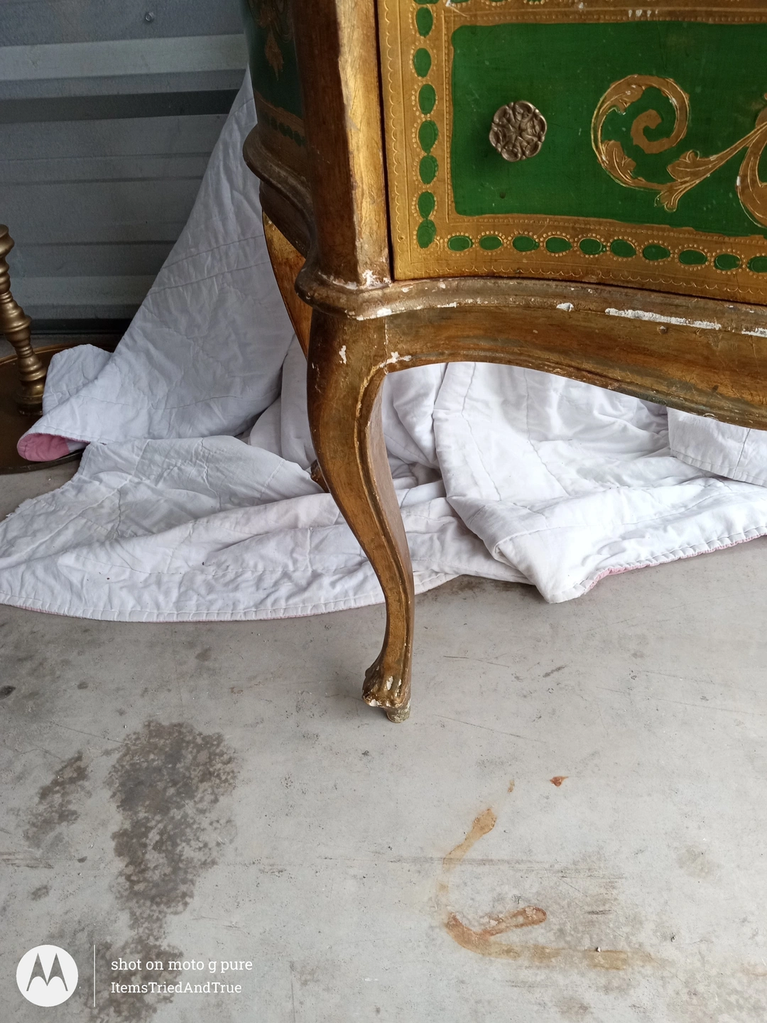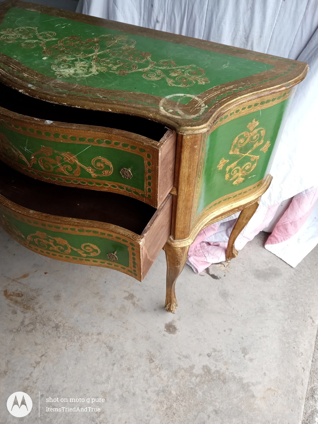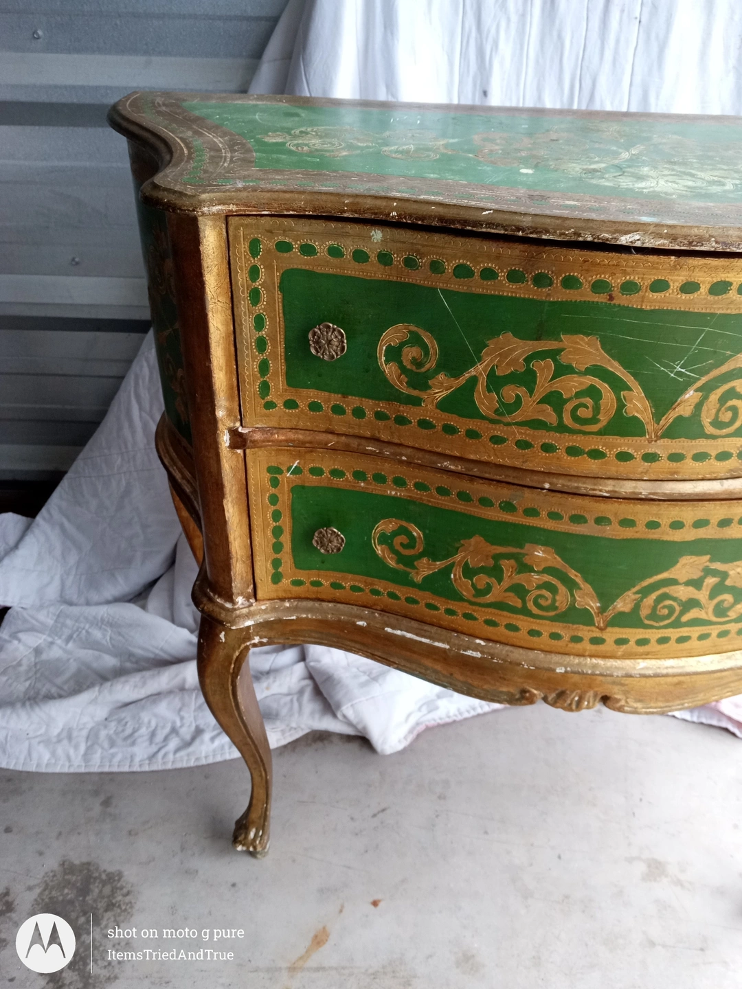 Beautiful vintage green & gold chest of drawers with ornate French‑style detailing. Hand‑painted floral scrollwork, curved front, and carved gold legs make this a standout accent piece for any room.