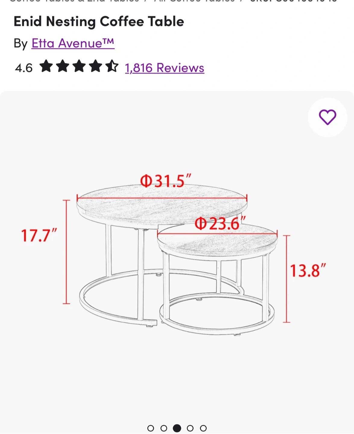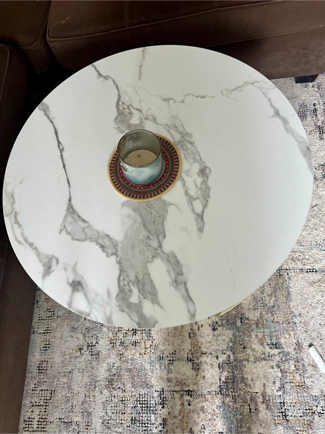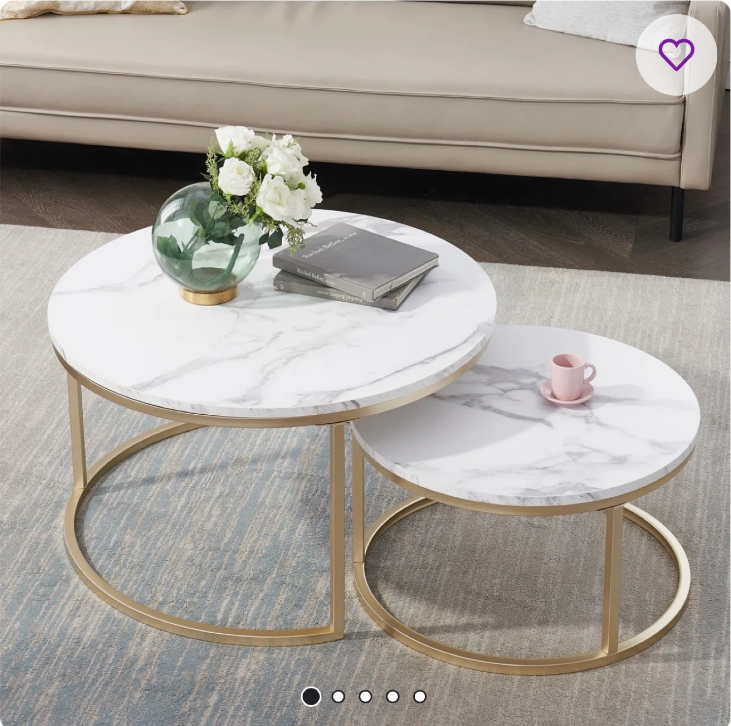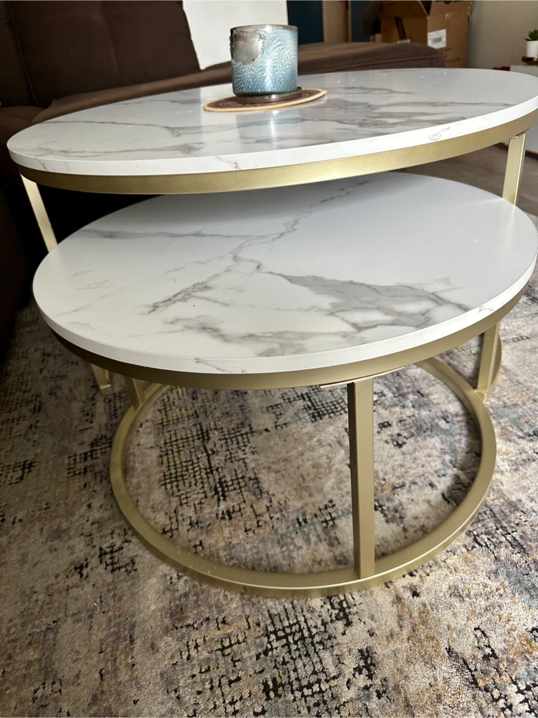 A set of two nesting coffee tables with a faux marble finish and gold metal frames. The larger table has a diameter of 31.5" and a height of 17.7". The smaller table has a diameter of 23.6" and a height of 13.8". These tables can be used together or separately to fit your space needs.