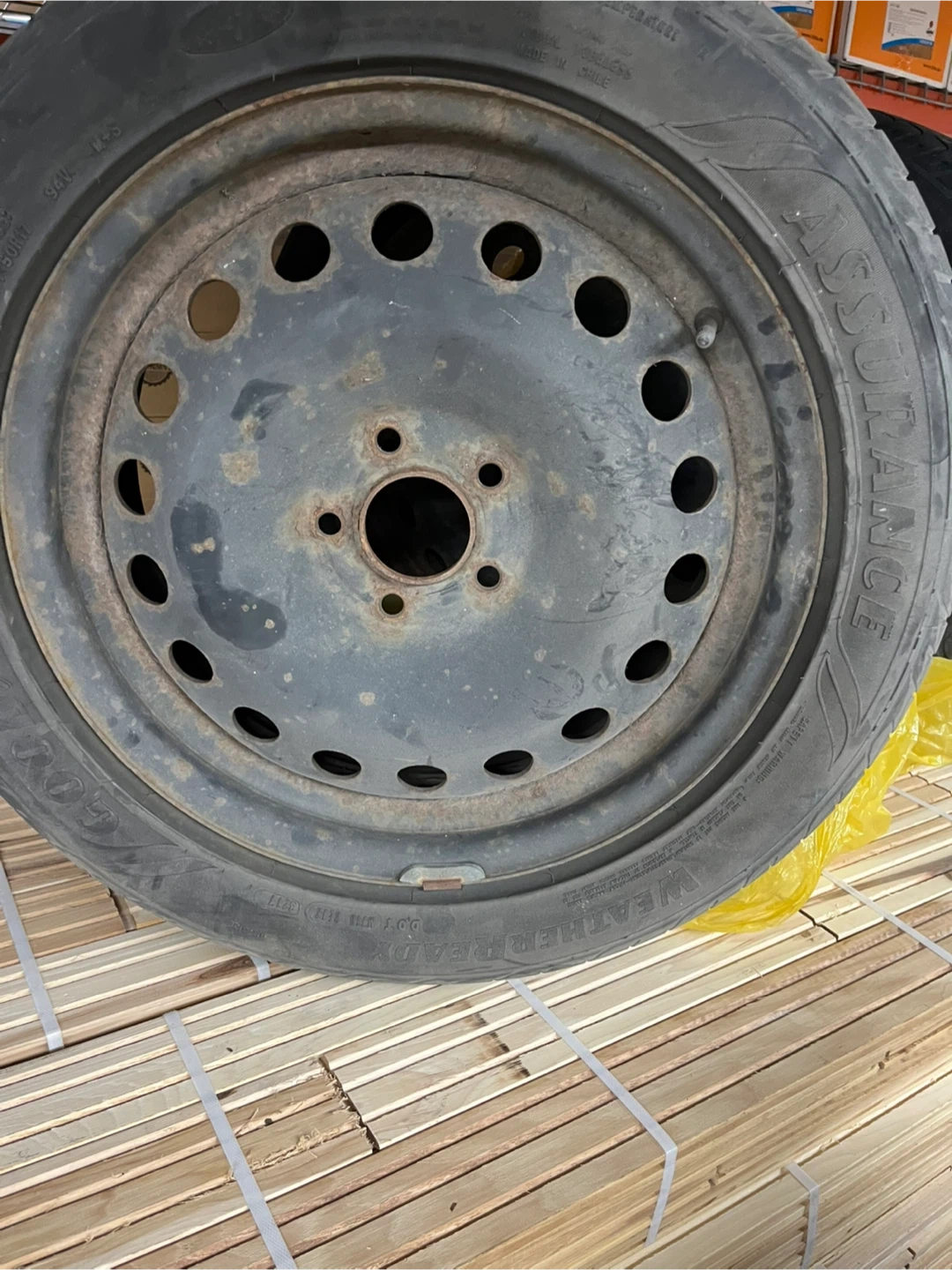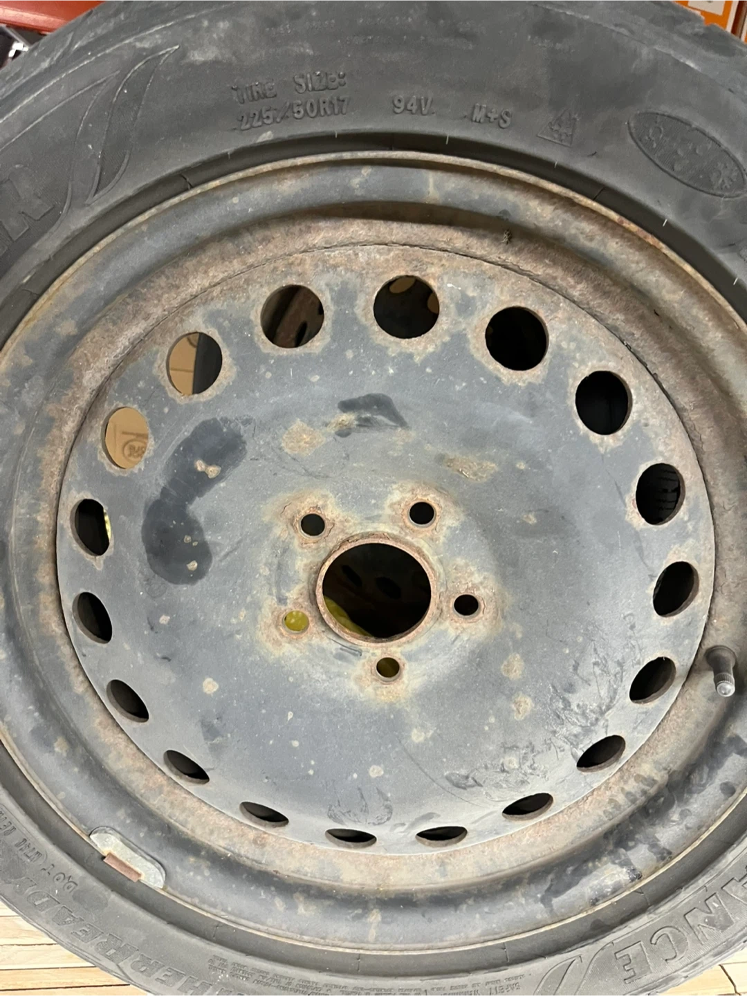 This is a Goodyear Assurance spare tire with a size of 225/50R17 94V. It's a full-size spare rim with a tire on it.