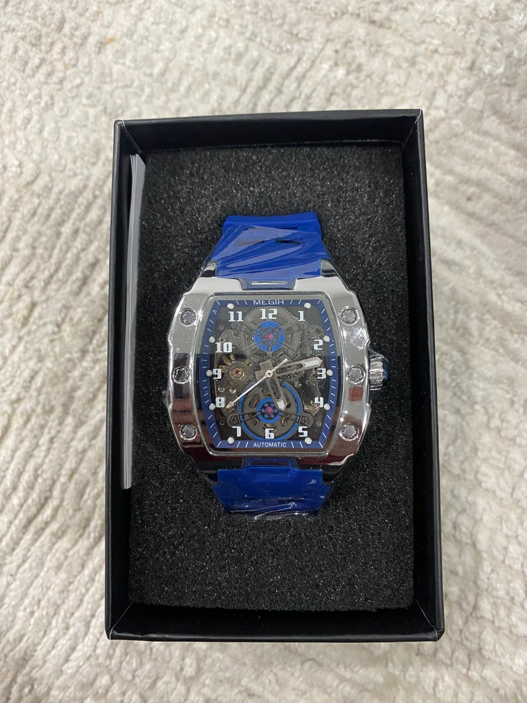 This MEGIR automatic watch features a silver-tone case with a blue silicone strap. It has a skeleton dial and is presented in its original box. This watch is automatic, meaning it winds itself with your movement.