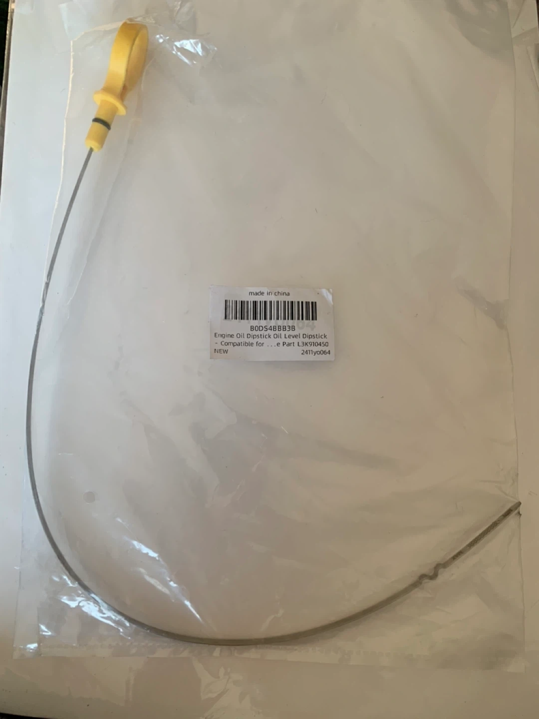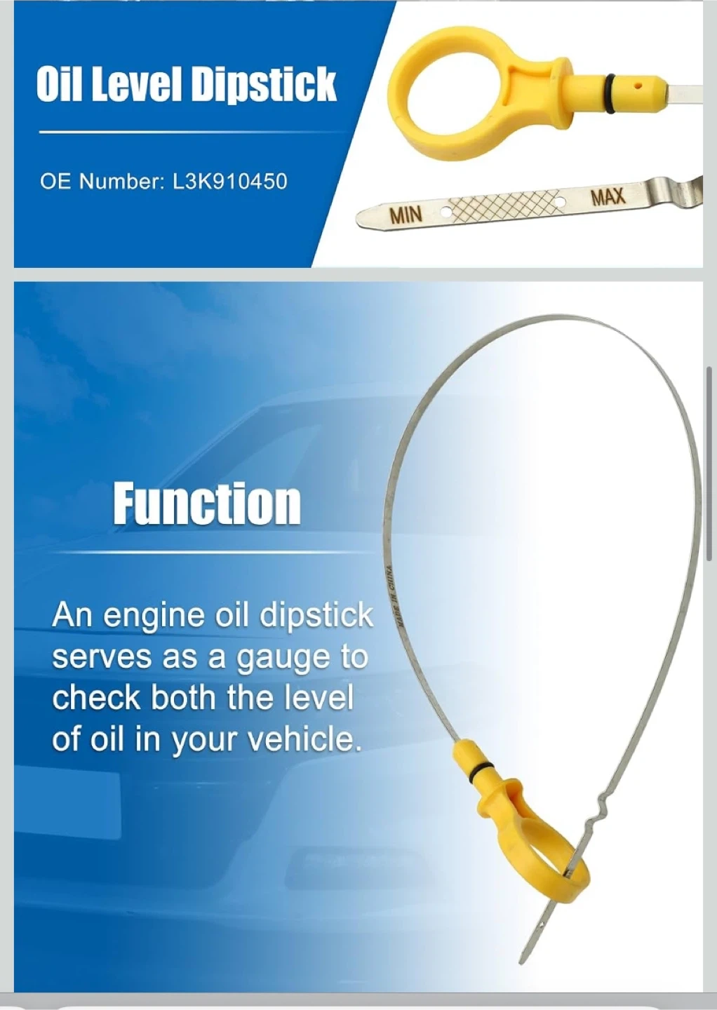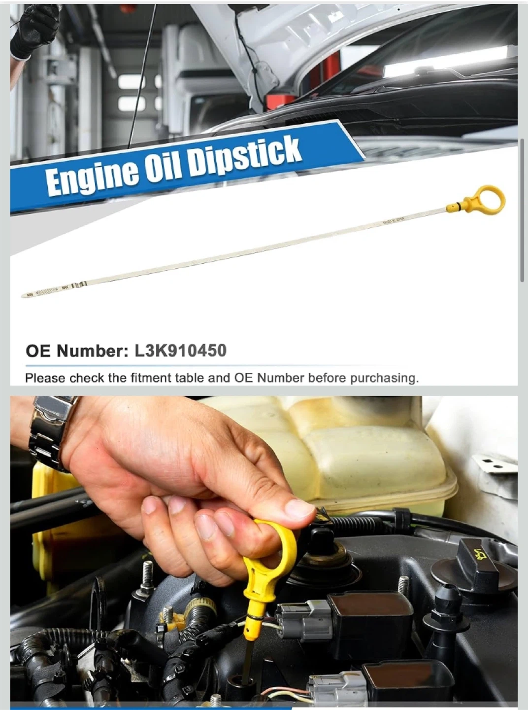 This engine oil dipstick is designed to check the oil level in your vehicle. It's made with a yellow handle and a metal rod. The OE number is L3K910450. This part is compatible with specific vehicle engines.