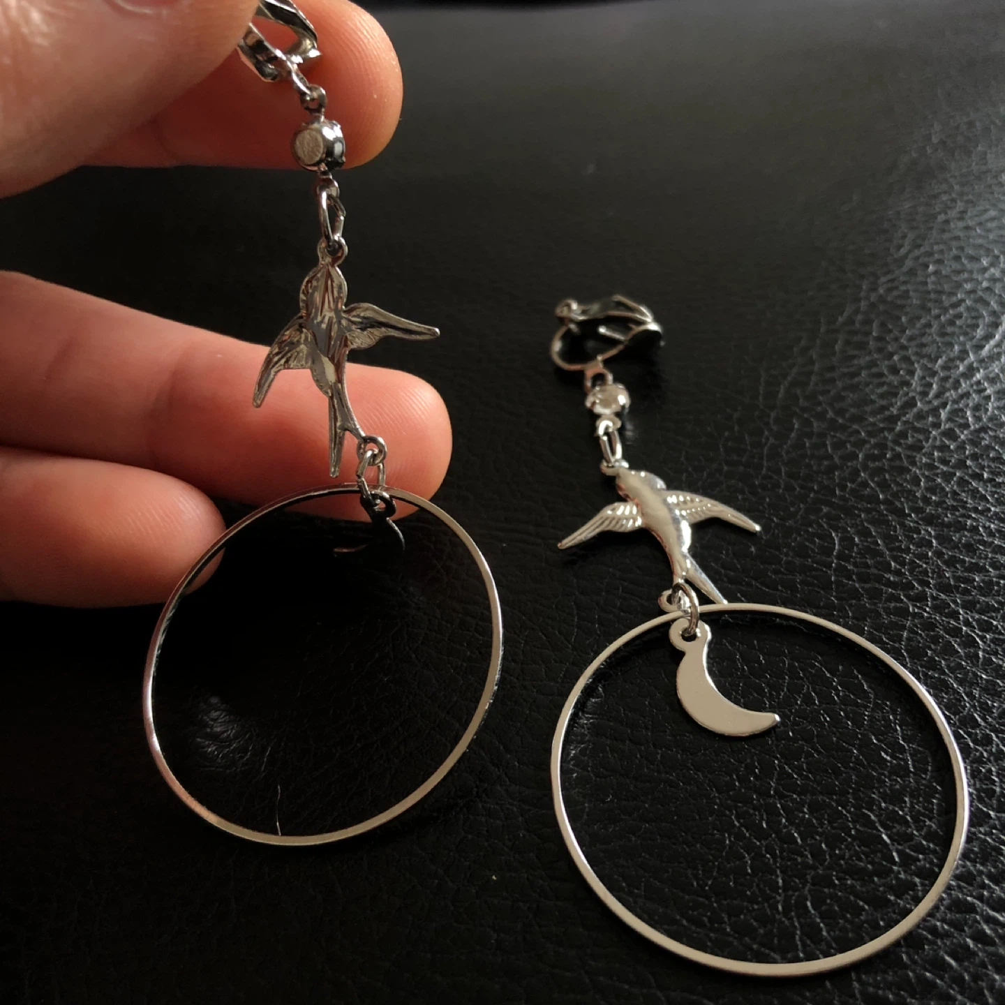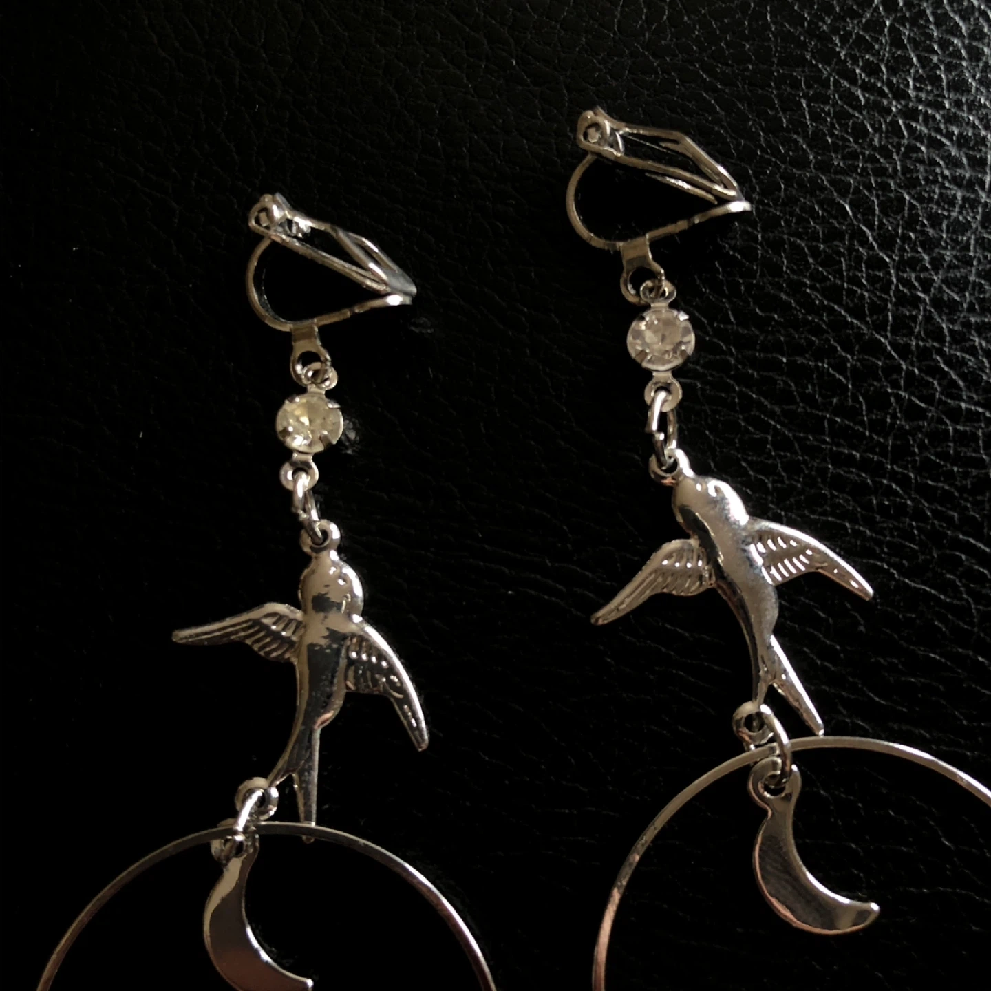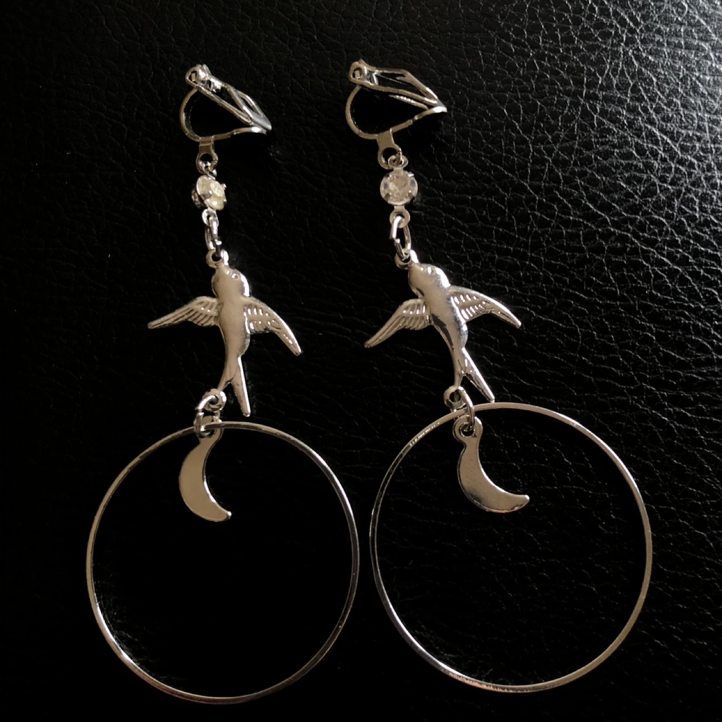 These clip-on earrings feature silver-tone metal. Each earring has a hoop with a dangling bird charm and a crescent moon charm. They're a fun accessory for everyday wear!