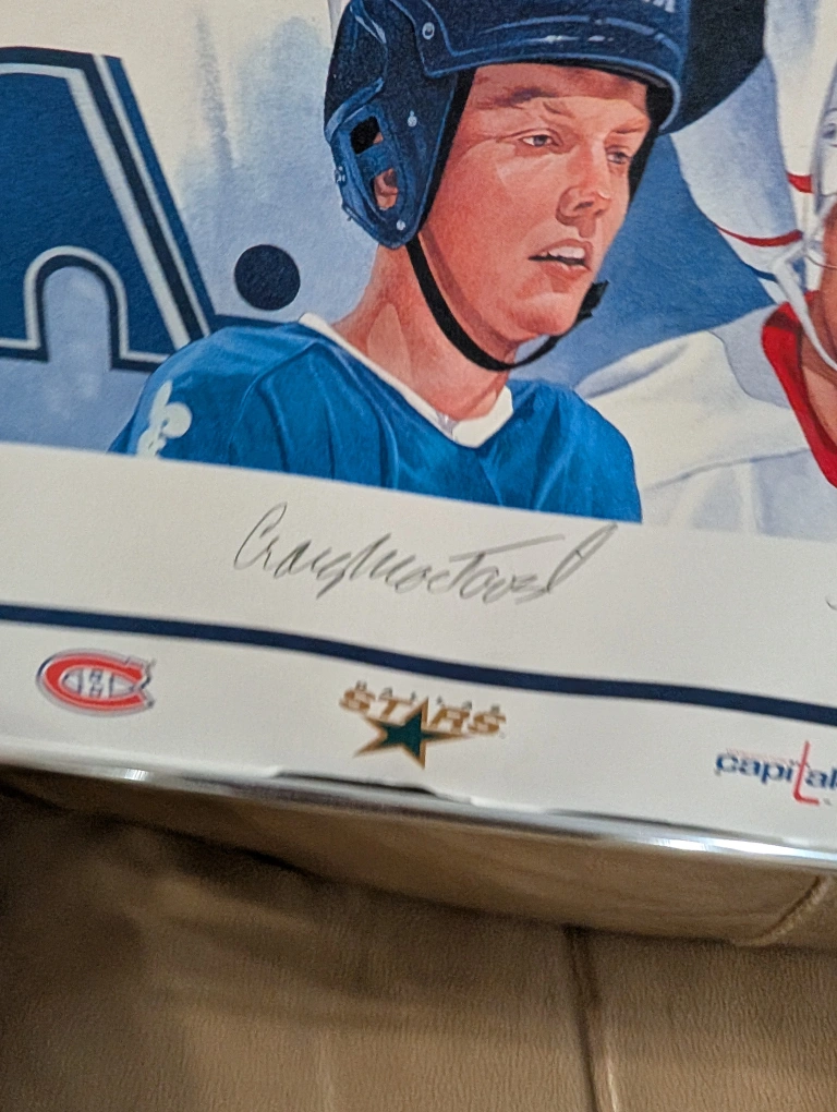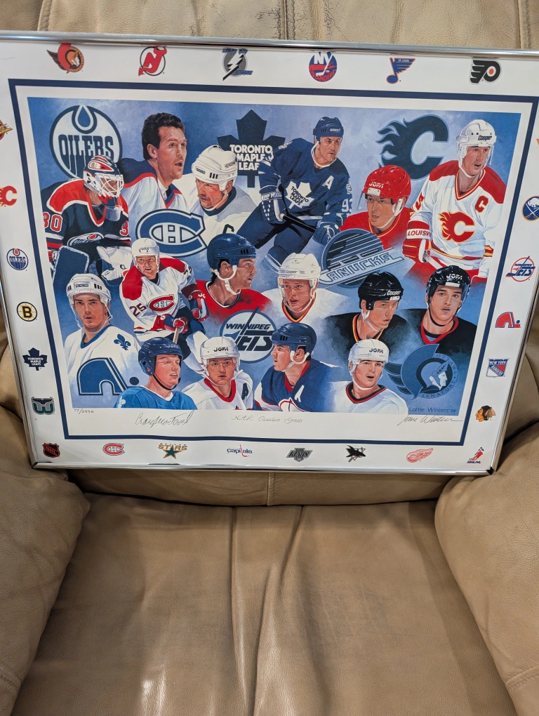 Framed print featuring NHL Canadian Greats. It includes players from the Oilers, Maple Leafs, Canadiens, Flames, Canucks and more! Signed by Craig Mactavish