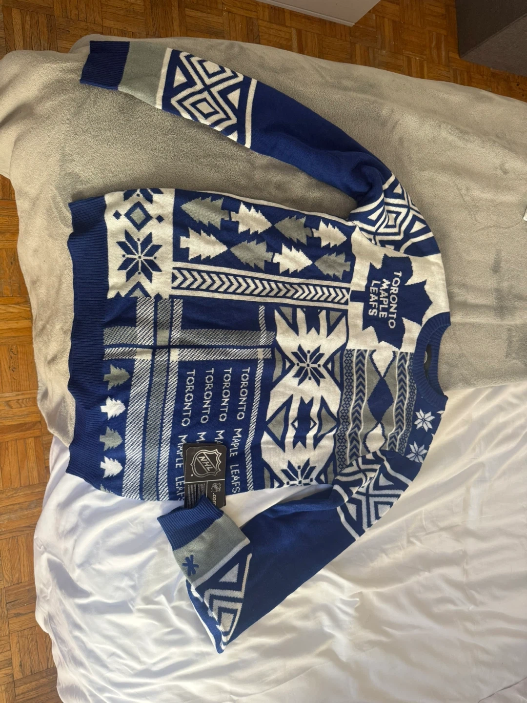 68Selling a Toronto Maple Leafs ugly sweater in size small! It's in great condition (BRAND NEW) and perfect for showing your team spirit during the holidays or any game day. Official NHL licensed product.