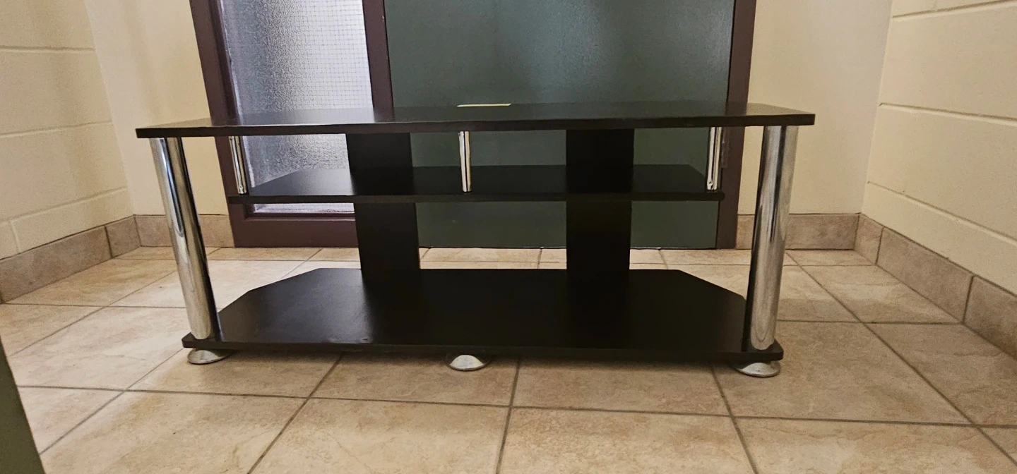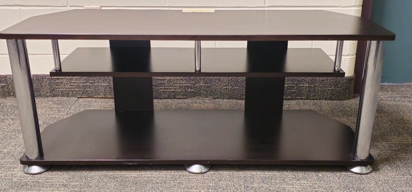 A dark brown TV stand with two shelves and shiny metal legs. It's a practical piece for your entertainment setup. The stand has a modern look that fits most living rooms. Use it to organize your TV and media devices!