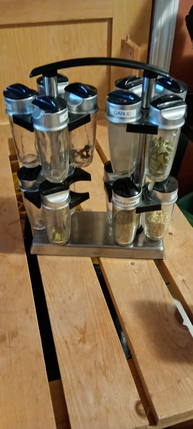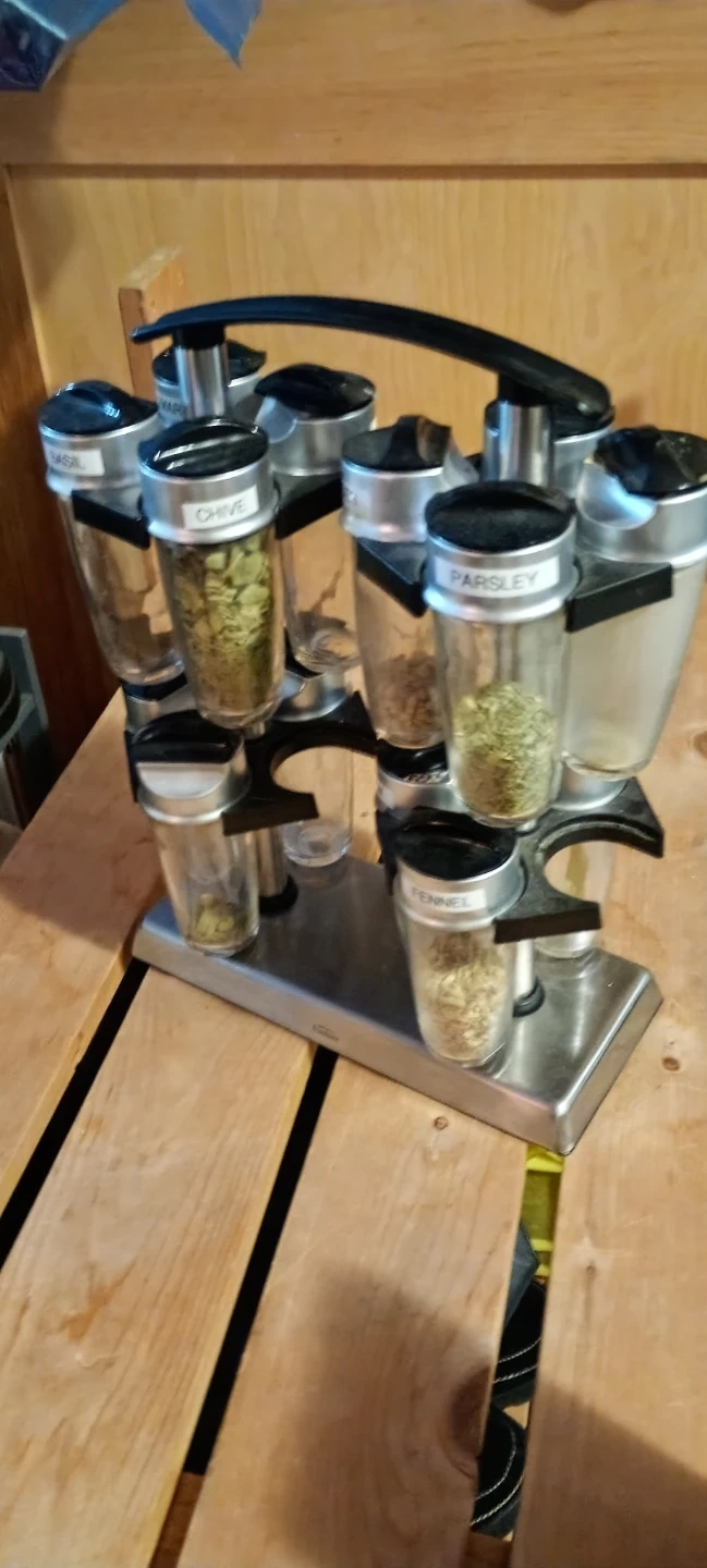 This is a rotating spice rack that comes with 10 glass jars. It features labels for common spices like basil, chives, parsley, fennel, garlic, and marjoram. The rack is made of stainless steel and has a modern design.
