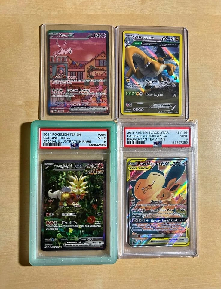 All cards are in NM condition. Looking for cash but open to trades at 75-80%. All cards are under Collectr value. Mew EX promo - $110, Dragonite - $25, PSA 9 Gouging Fire EX - $55, PSA 9 Eevee & Snorlax - $215. Prices are relatively firm because they’re listed under market value. Take all for $400.