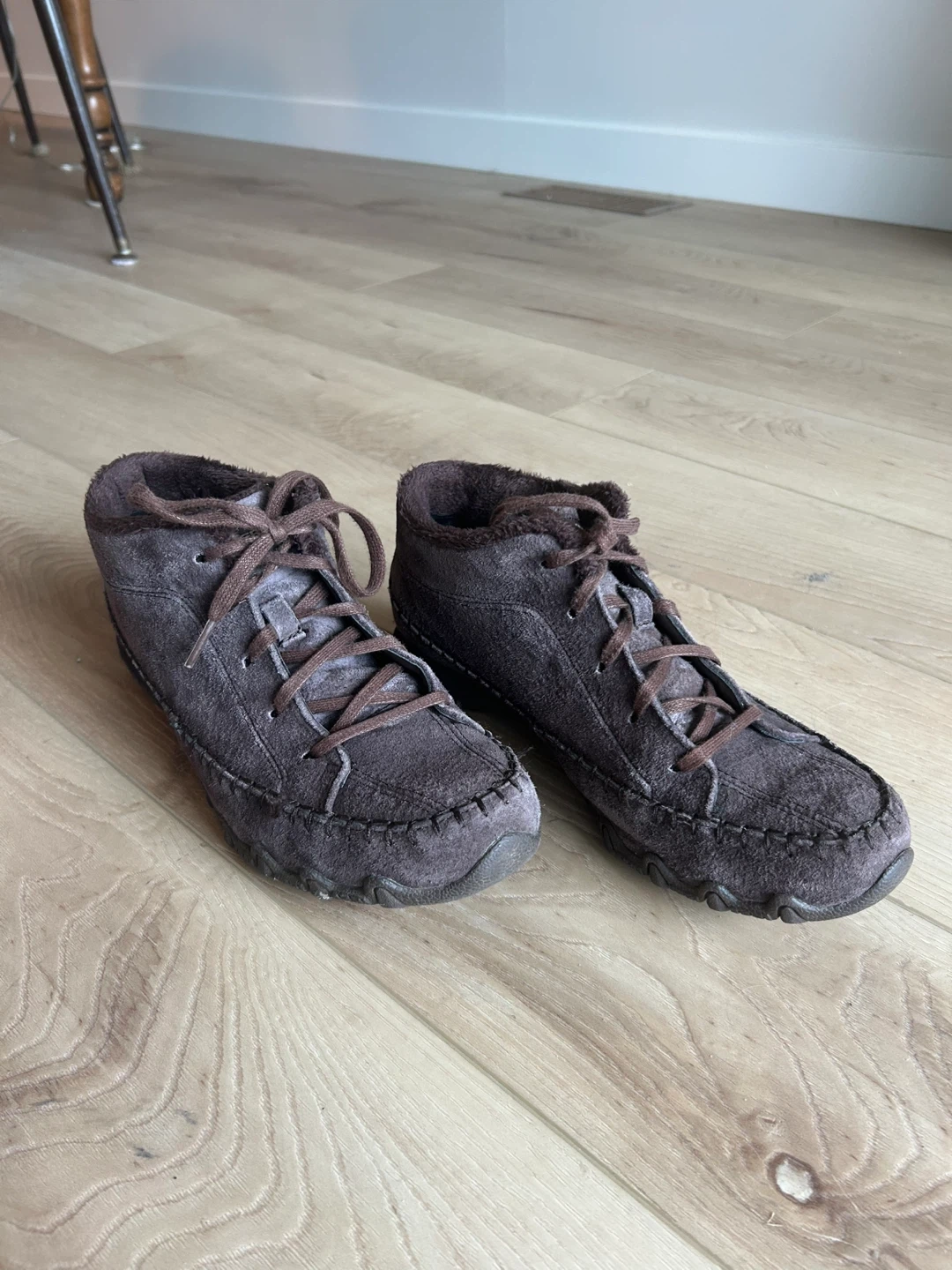 Cozy brown suede moccasin boots from Skechers. These are lined with soft faux fur for extra warmth and has soft interior for foot soles. Features a lace-up front and a flexible sole.