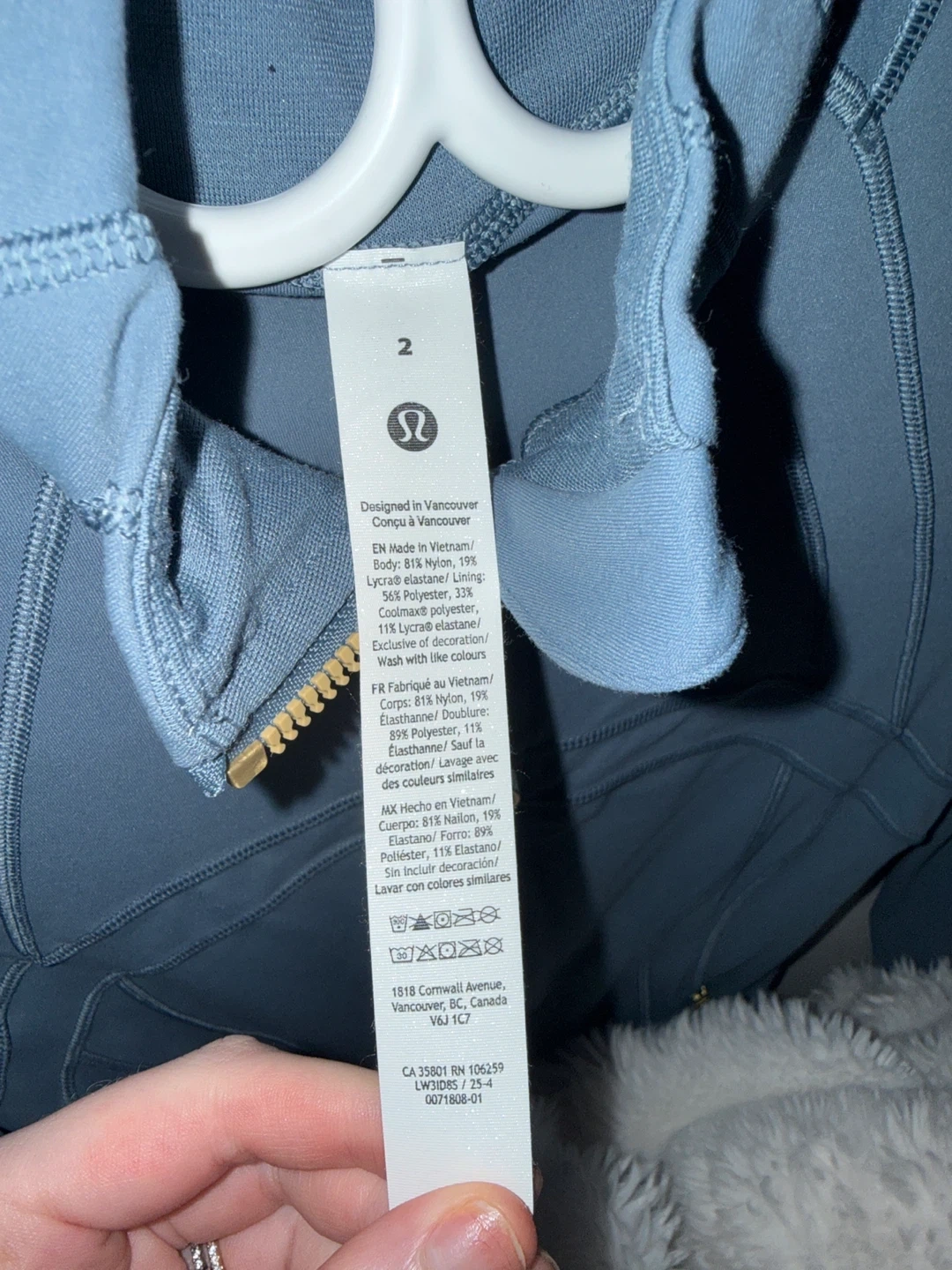 This Lululemon jacket is designed in Vancouver. It's made with 81% Nylon and 19% Elastane. The fabric also includes 56% Polyester, 33% Cotton and 11% Lycra® elastane. This jacket is perfect for light workouts or everyday wear.