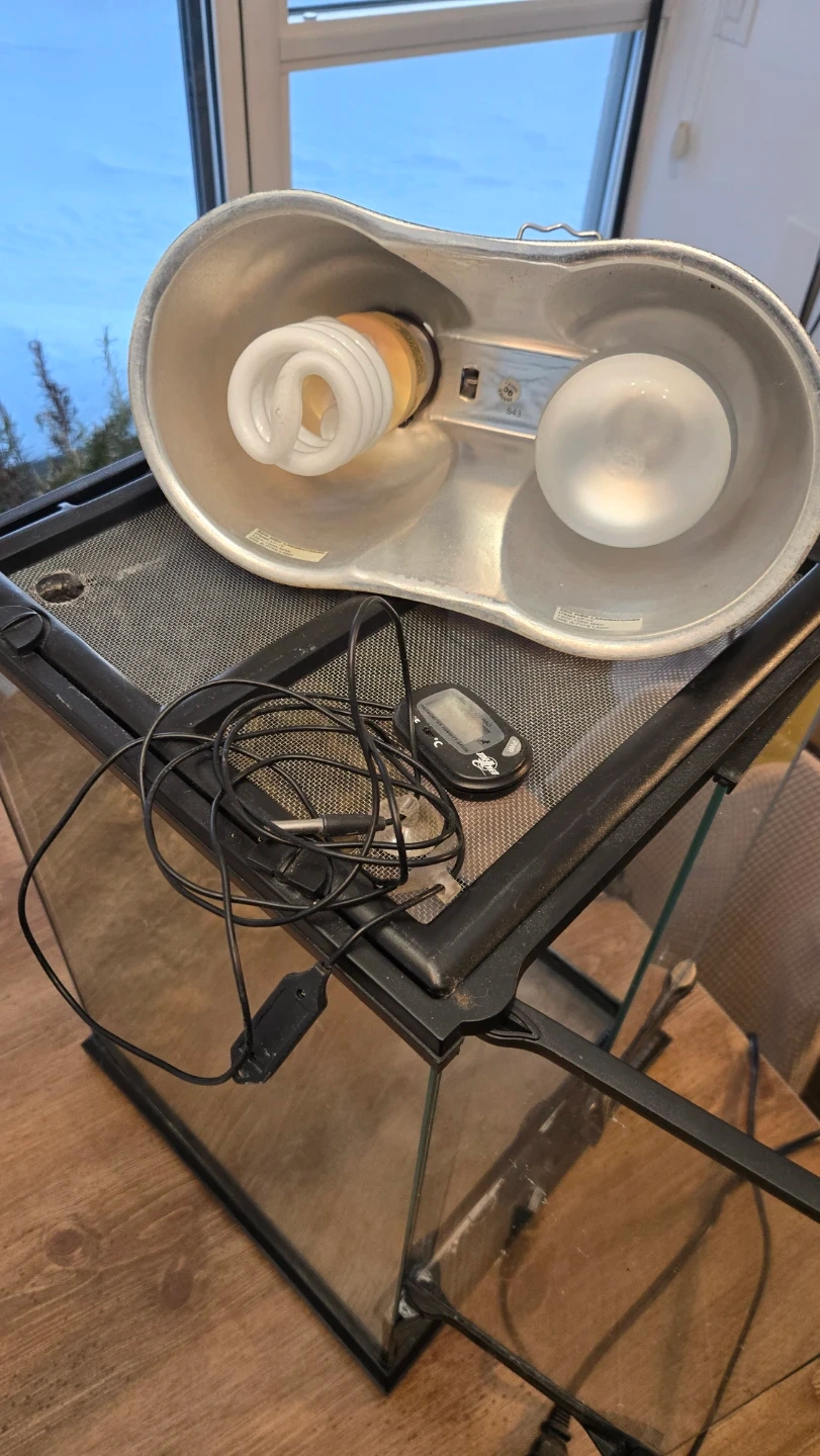 Included is a with dual lamp fixture containing a UV and heat lamps, and a dual thermometer/humidity gauge.