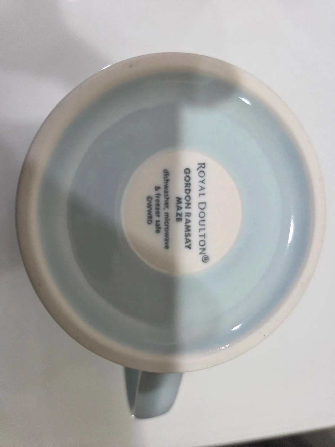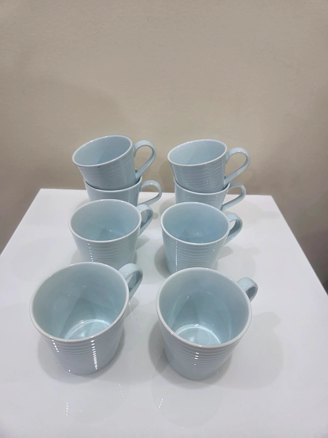 Set of 8 light blue ceramic mugs from Royal Doulton's Gordon Ramsay Maze collection. They're dishwasher, microwave, and freezer safe. These mugs are great for your morning coffee or afternoon tea!