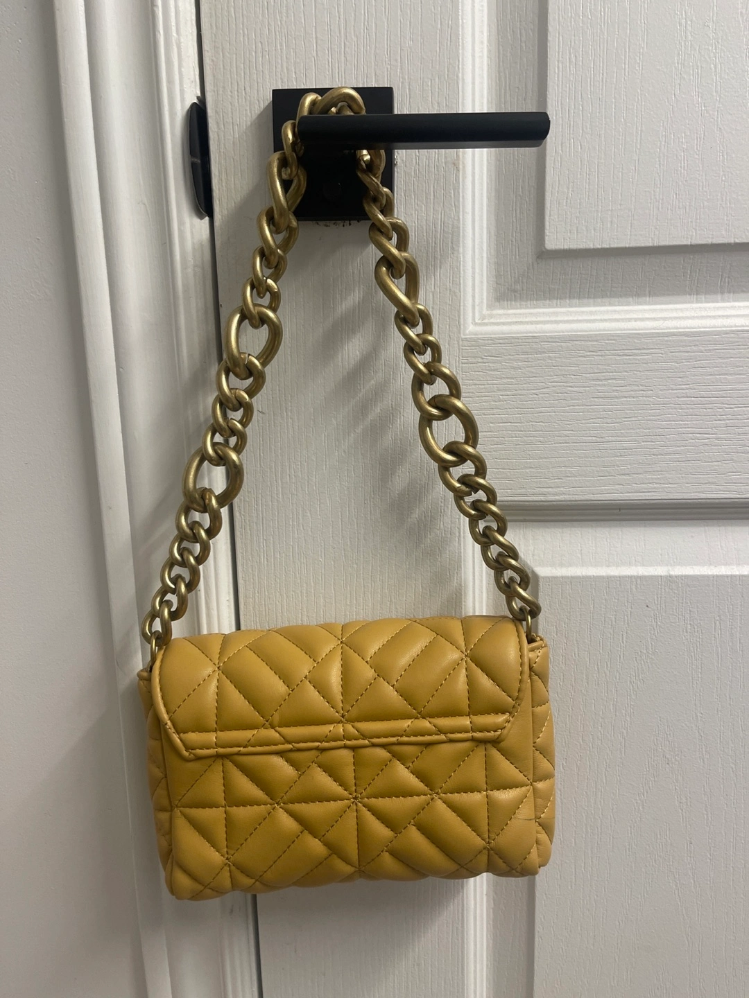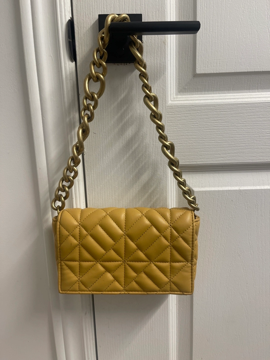 Small quilted shoulder bag. Mustard yellow colour. Features a gold chain strap. Good for everyday use.