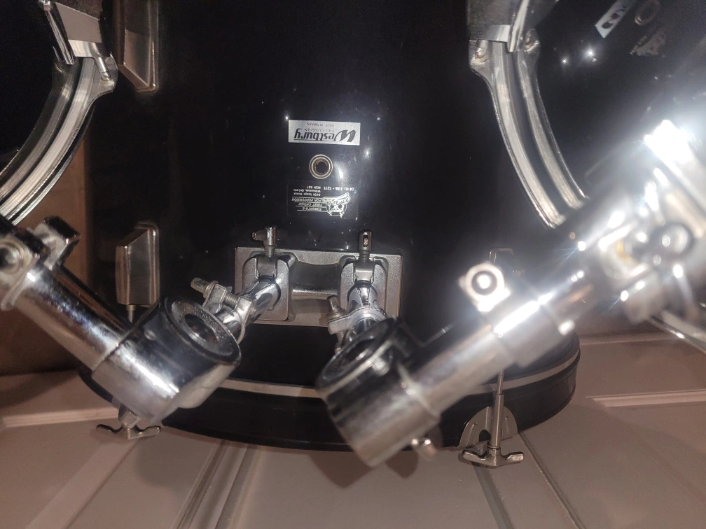 The bass drum has no pedal, and a small tear on the bottom, as seen in photos, easily repairable with a small piece of tape.