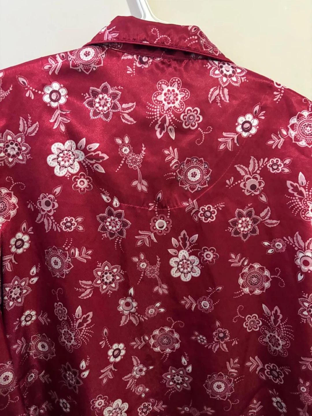 This satin pajama top has a bold floral print. It features a classic collar and button-up front with a chest pocket. It's made of shiny satin material.