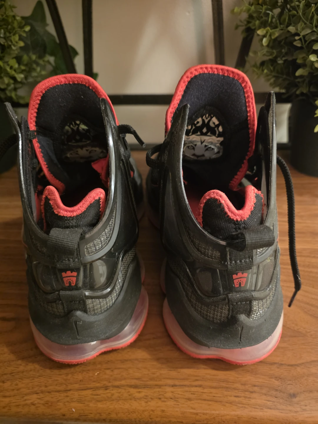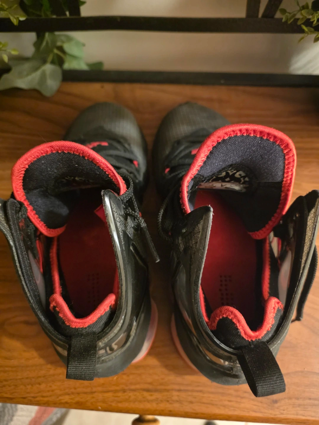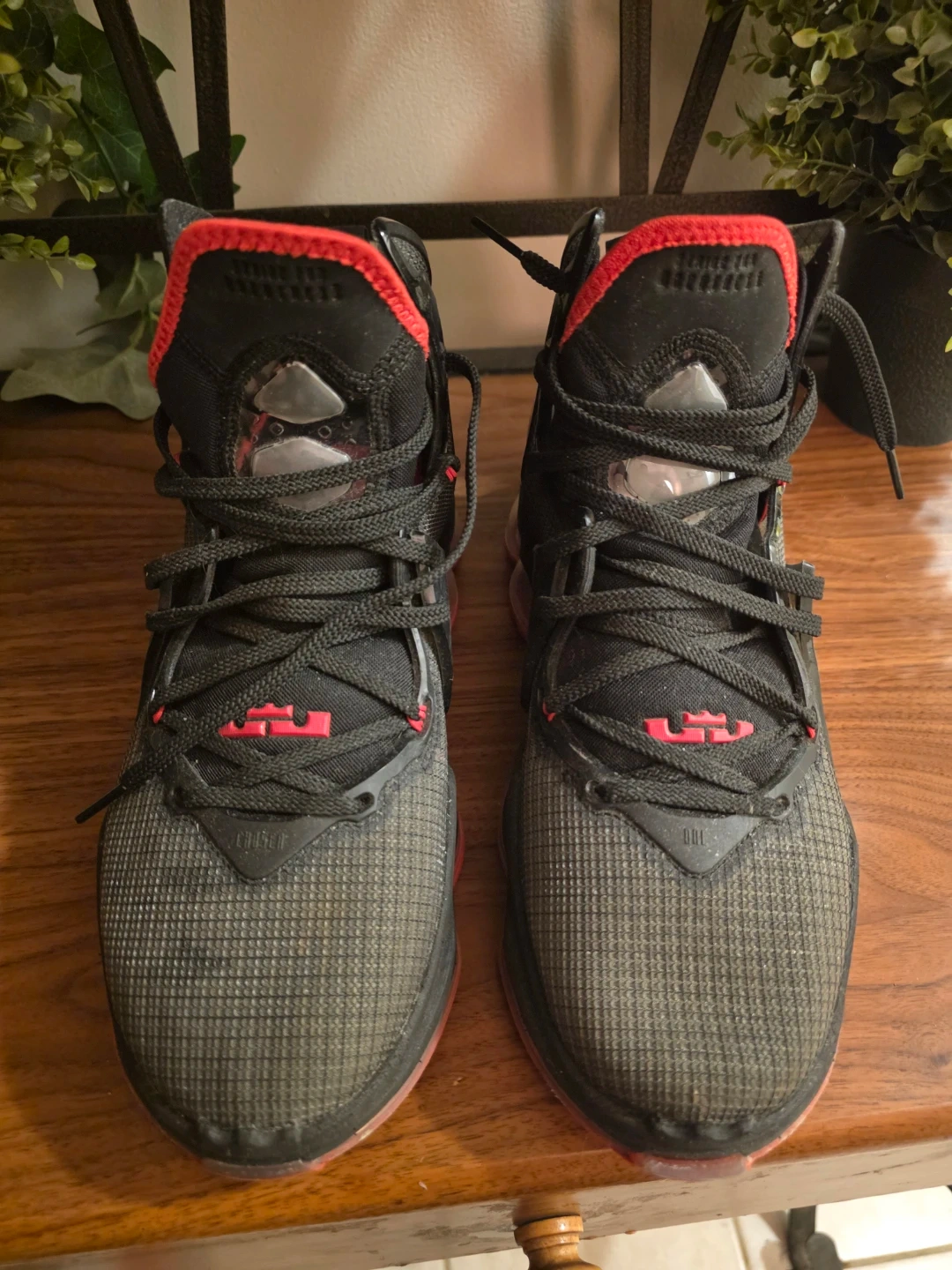 Black and red Nike LeBron XIX basketball shoes. Lace-up closure for a secure fit. Durable rubber sole.
