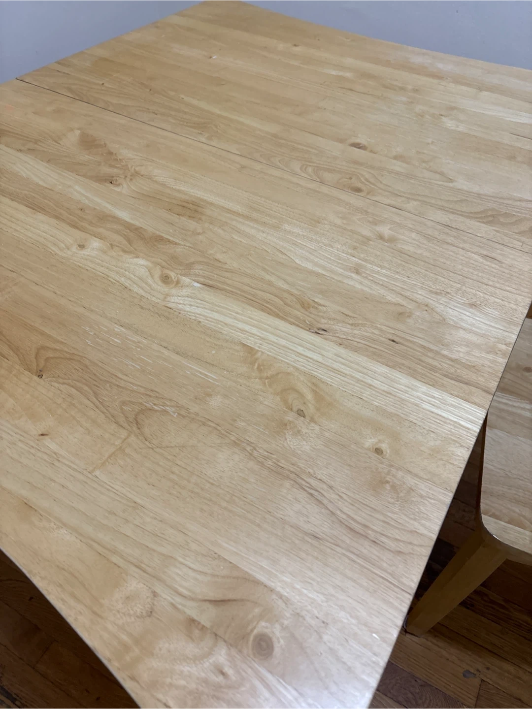 This is a light wood dining table with a matching chair. It's made of solid wood. The table has a curved design. This set is perfect for small spaces!