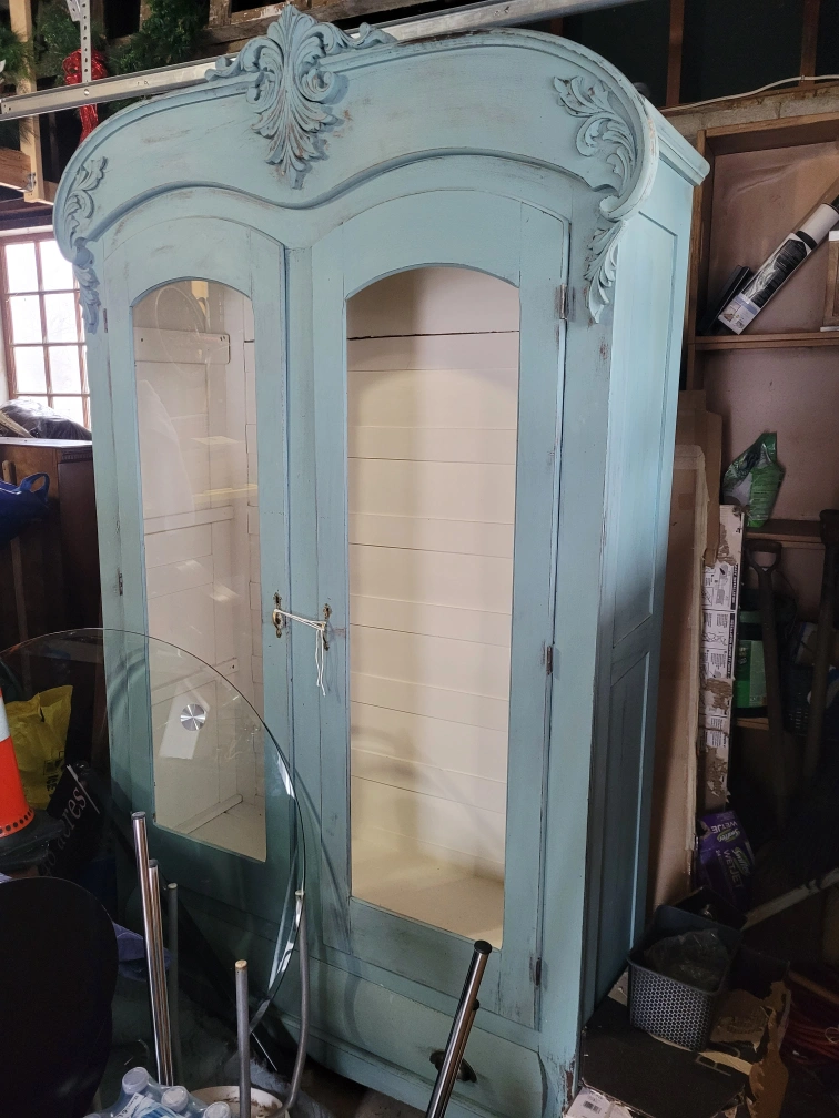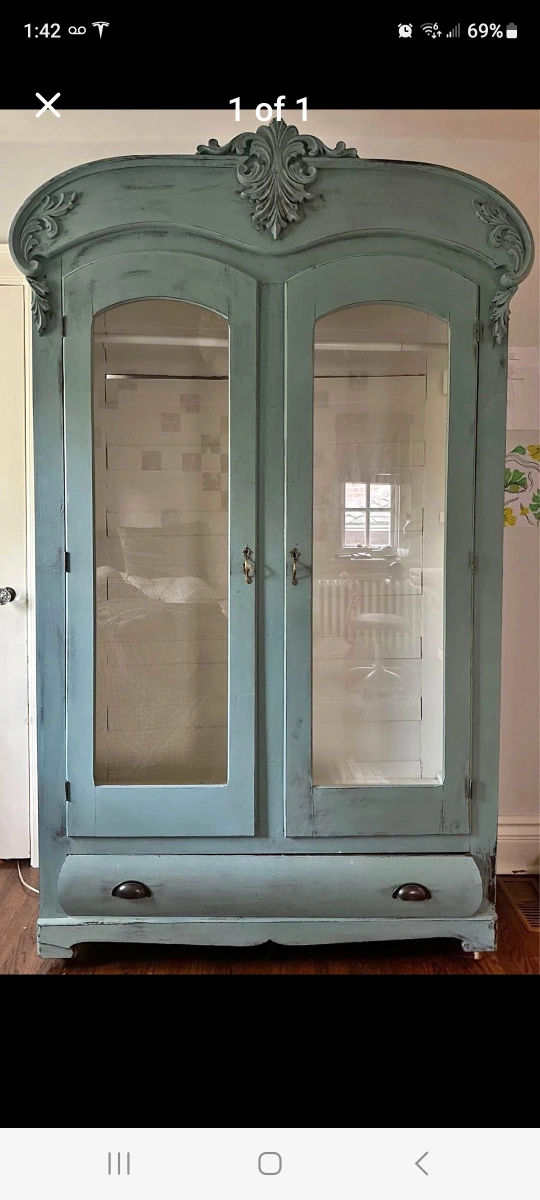 Beautiful antique armoire. Glass doors. one glass panel is missing. Can have 3 shelves but shelves not includes. One drawer. Dusty teal paint. Ornate detailing. Unique piece for your home. Retail $2500.