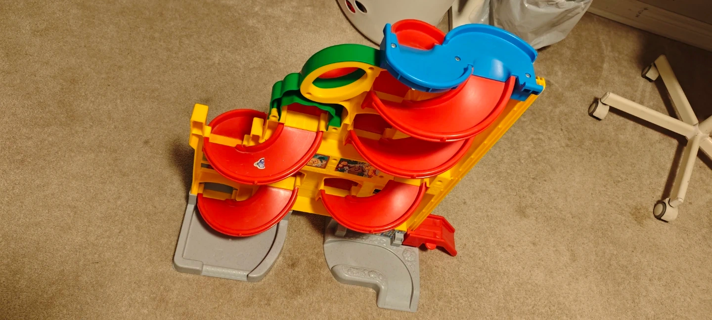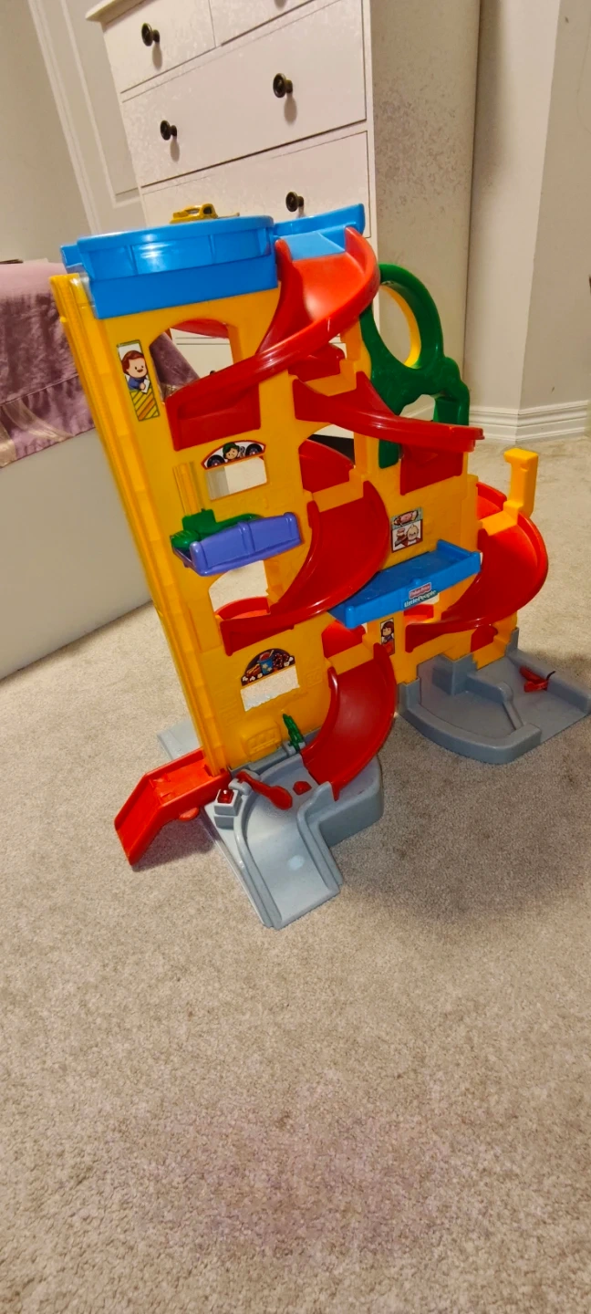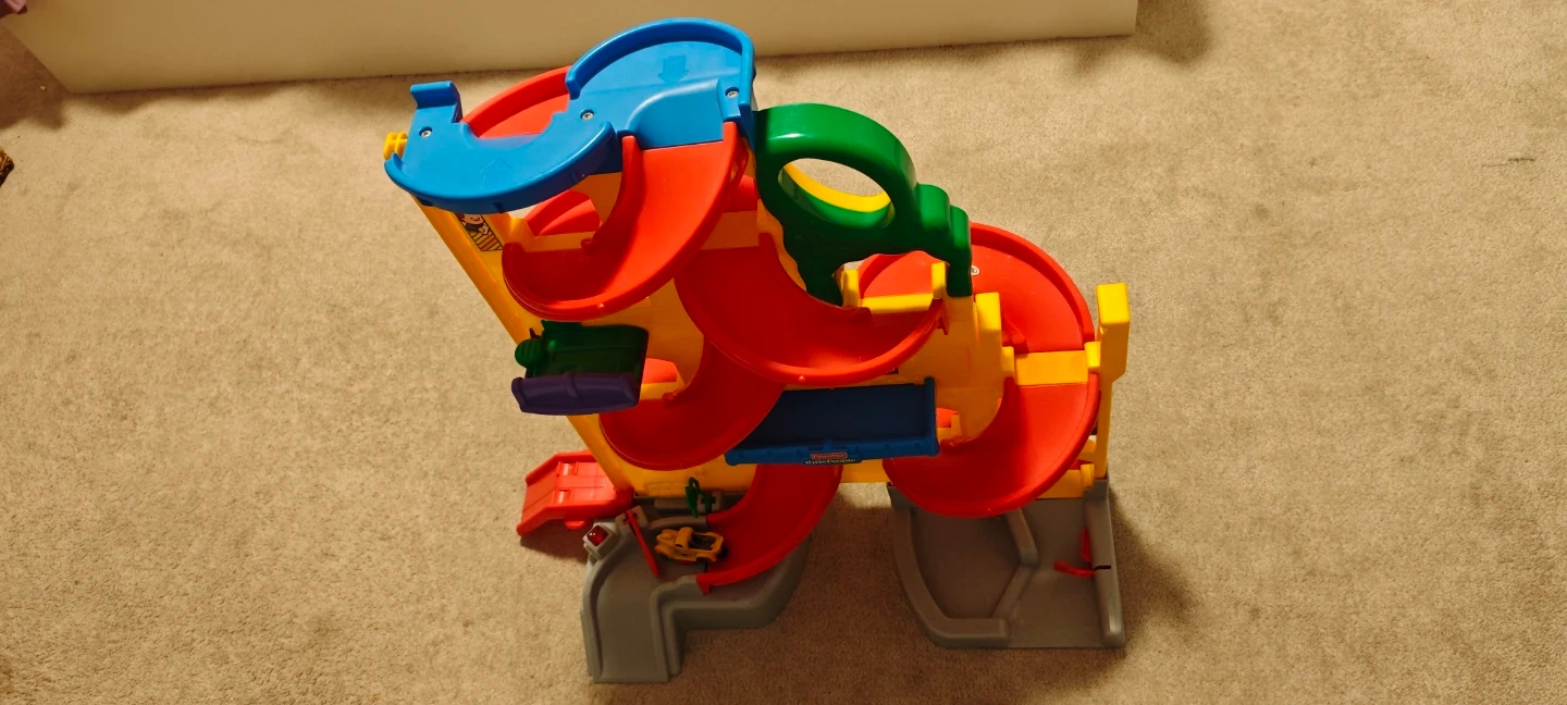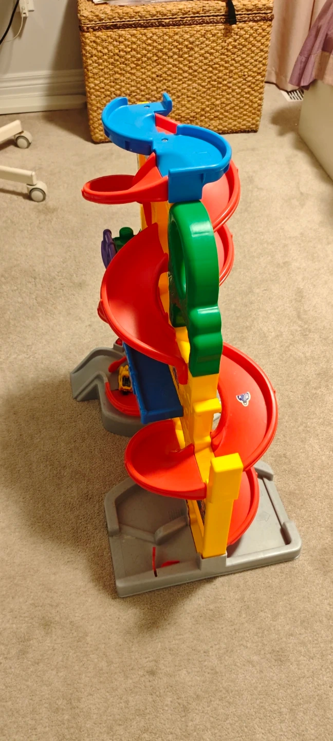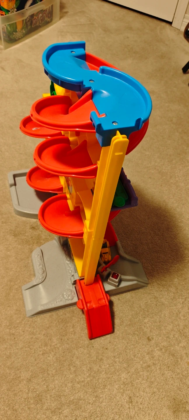 A fun multi-level spiral race tower for Little People Wheelies cars. It features colourful ramps and a parking garage level. This toy is designed for little hands and provides hours of active play.