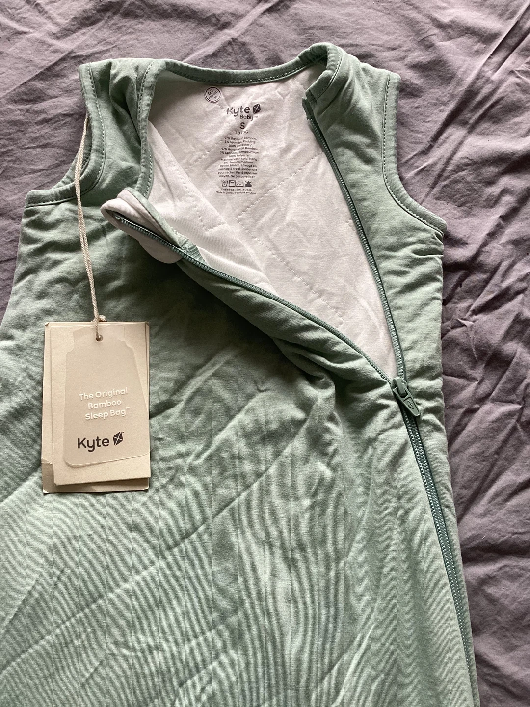 New Kyte Baby sleep bag in sage colour. It's a wearable blanket for babies 0-6 months. Made from bamboo. From smoke and pet free home.