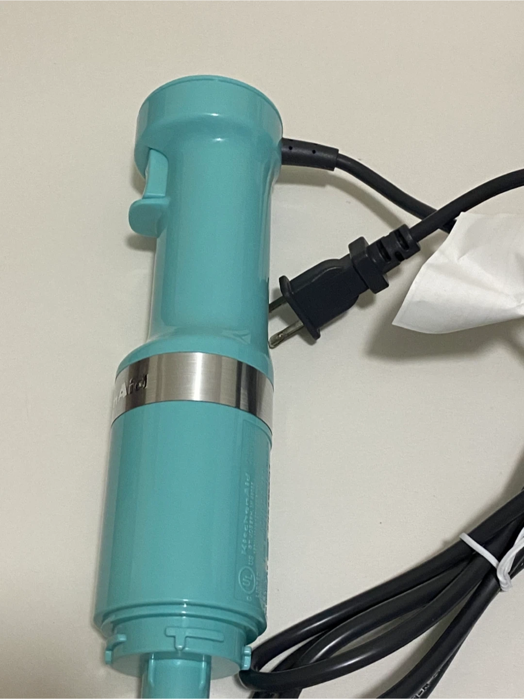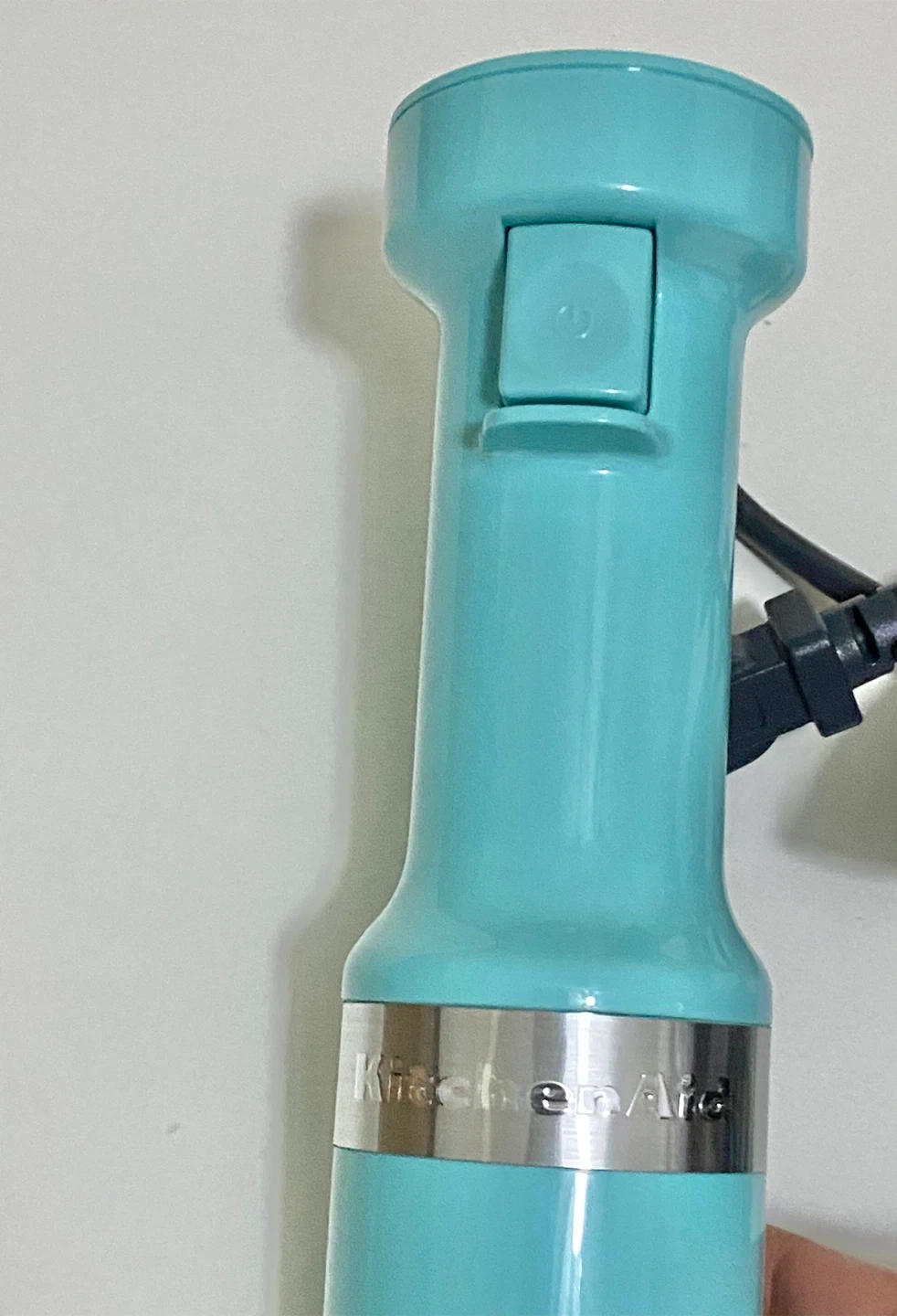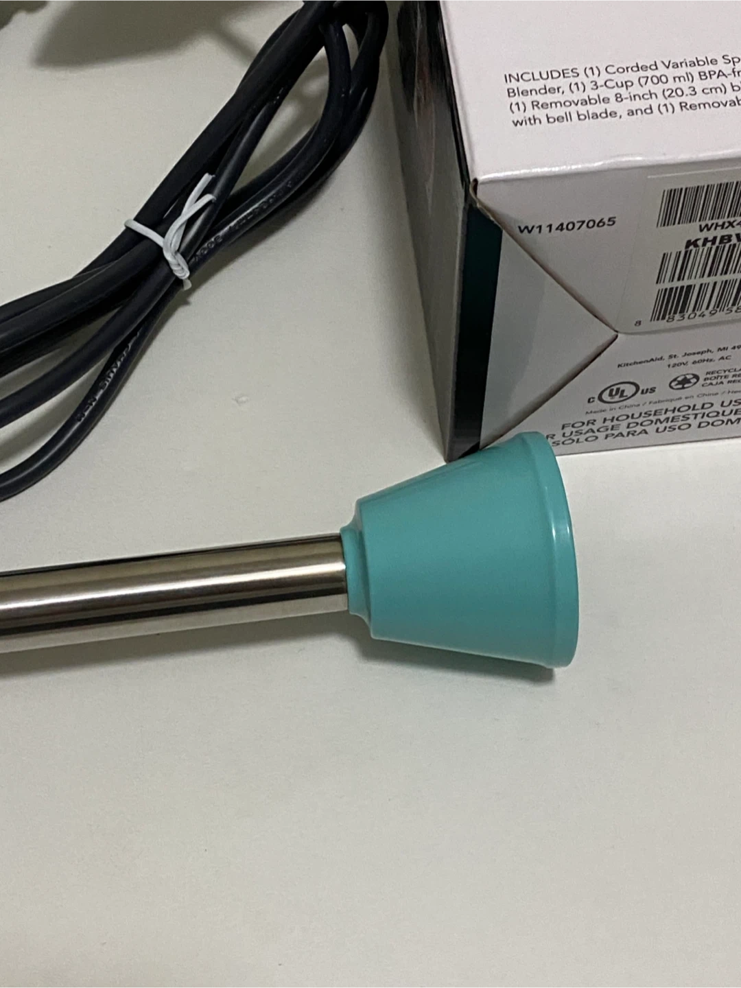 It's a KitchenAid corded variable speed hand blender in Aqua Sky. Includes a 20.3 cm removable blending arm with bell blade. Perfect for blending soups, smoothies, and sauces.