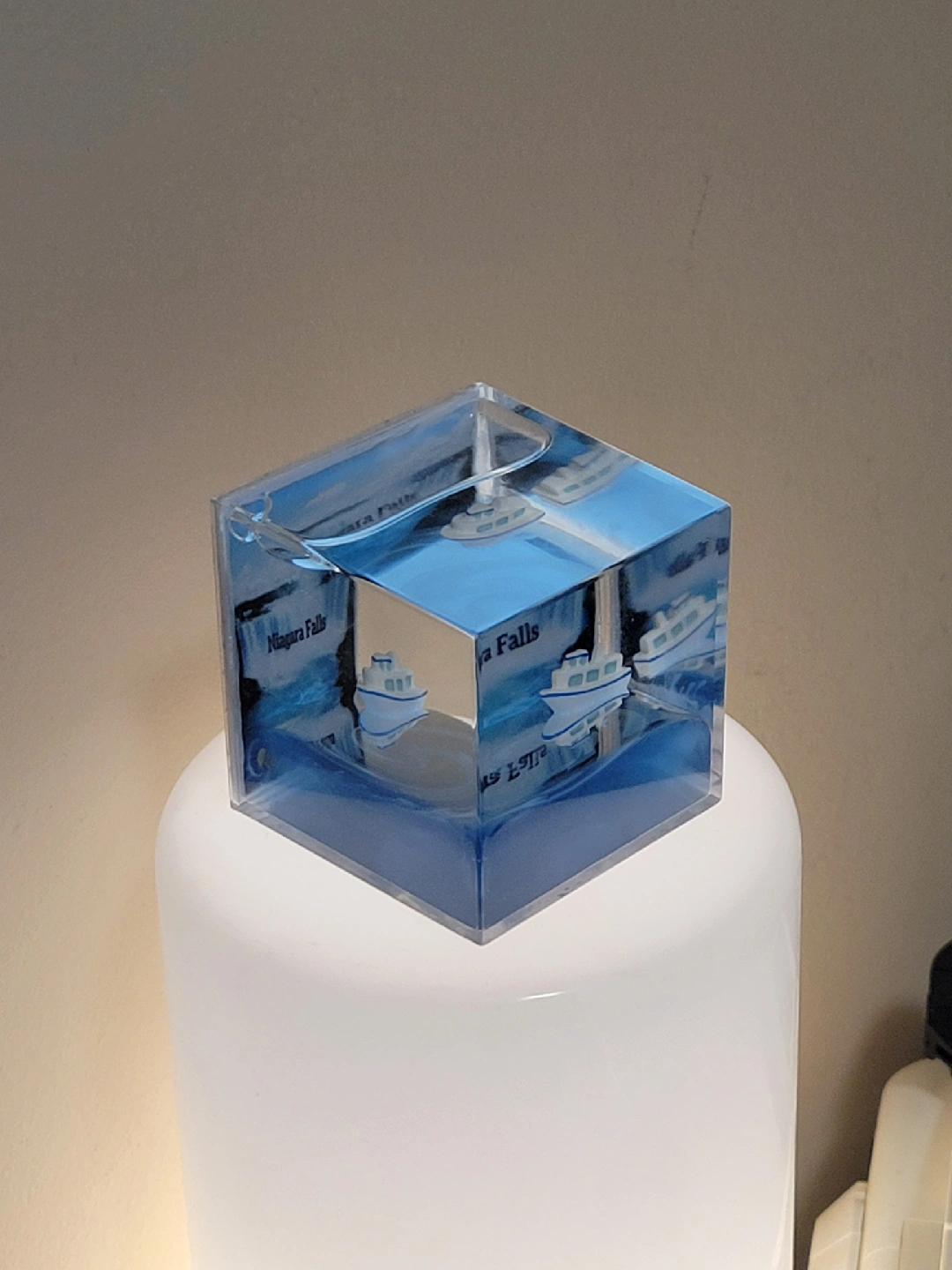 10A charming lucite cube featuring Niagara Falls and a boat! It's a unique piece that captures the beauty of this Canadian landmark. Perfect for adding a touch of nostalgia to any space
