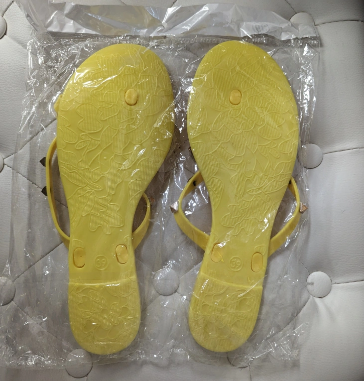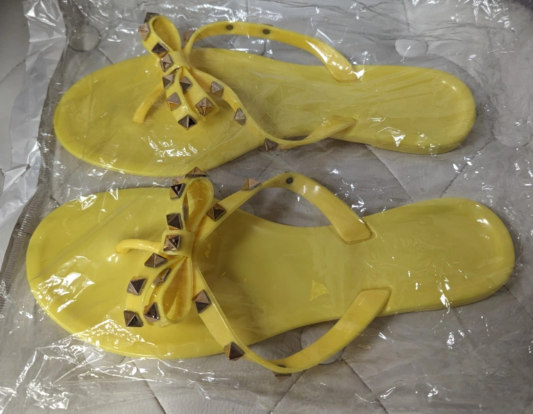 This jelly sandal is lightweight, has pyramid studs, a bow, flat, slip on, open toe, summer sandal