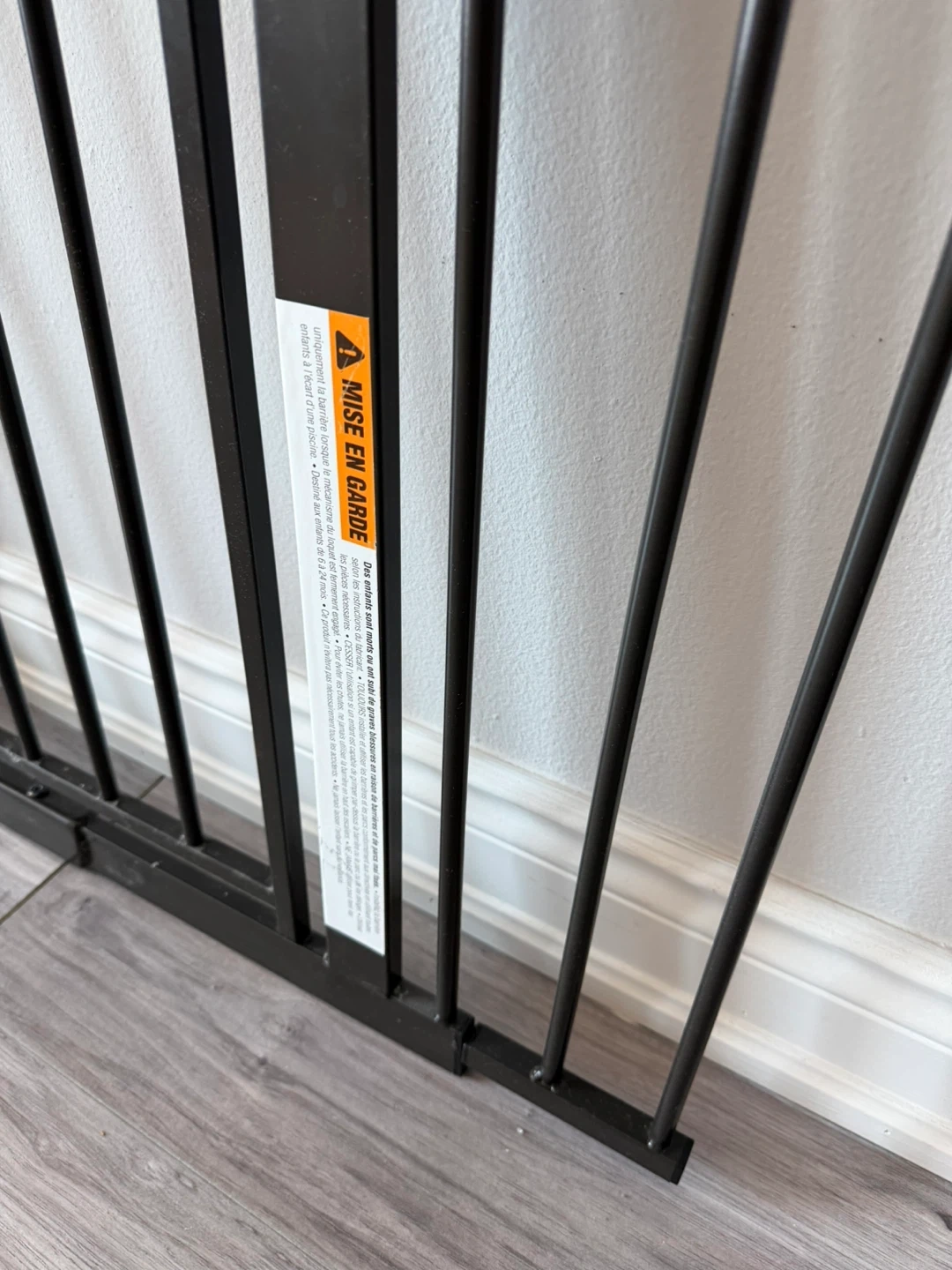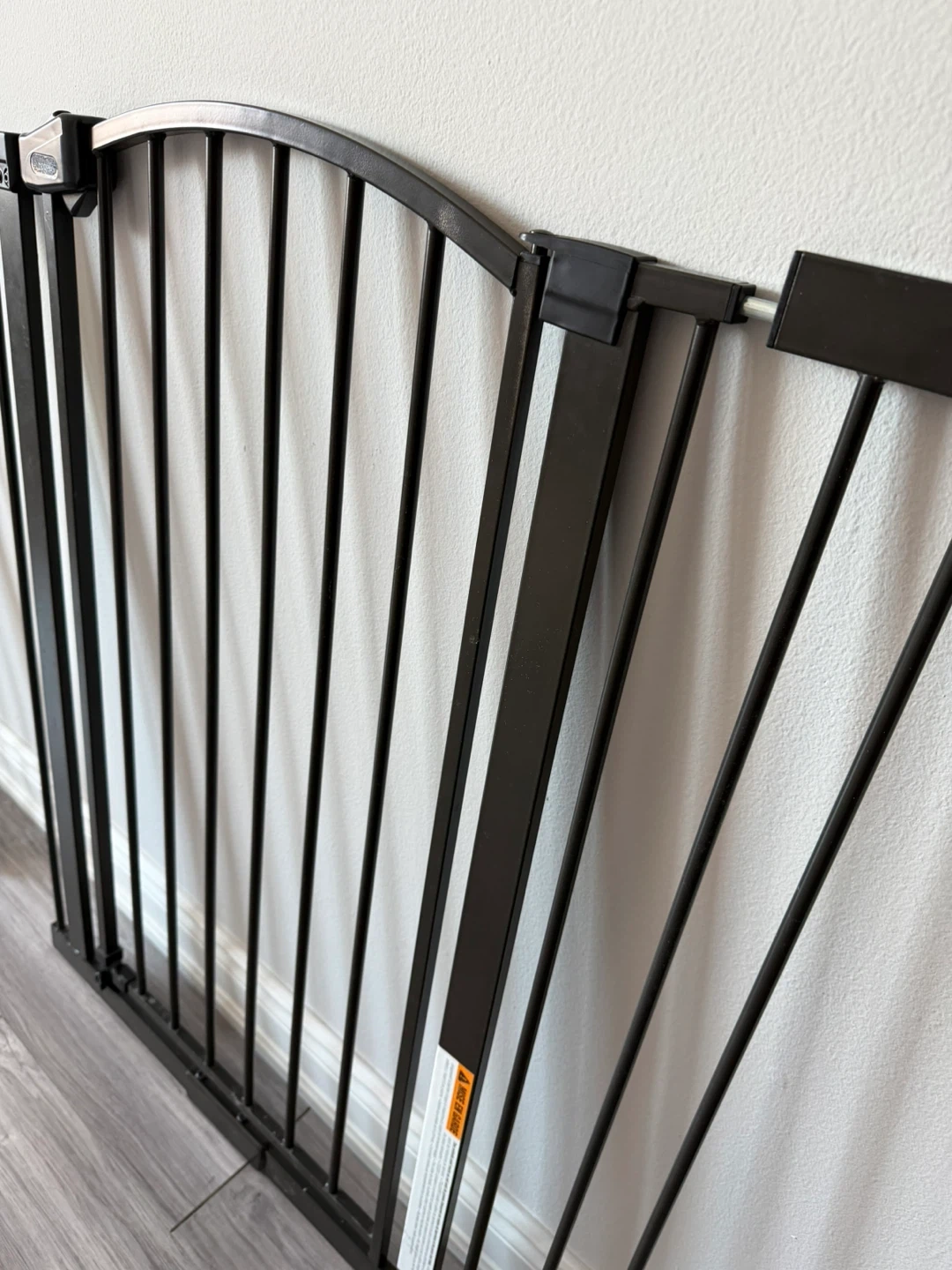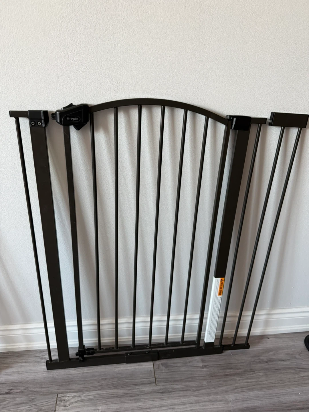 A dark brown metal baby gate from Regalo. This pressure-mounted gate is easy to install and features a walk-through door. It's great for keeping little ones safe in doorways or at the bottom of stairs. There are some parts missing. I sell as is.