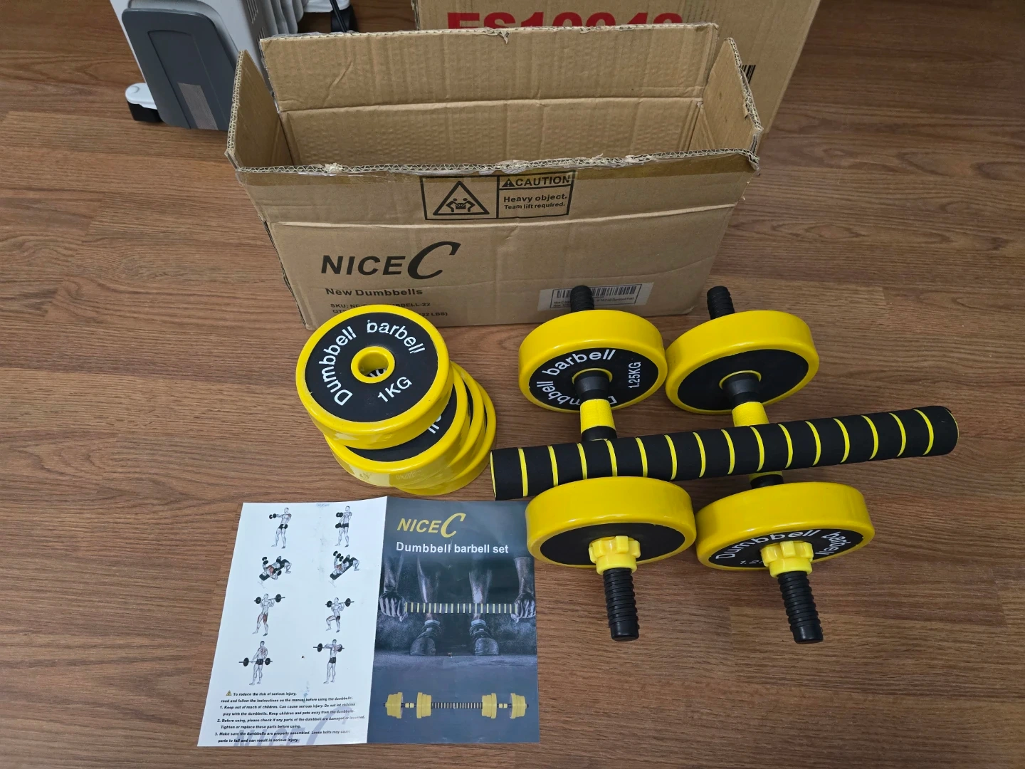 5Selling a brand new NICE C Dumbbell Barbell Set! It comes with the box and instructions. The weights are yellow and black. Great for home workouts!