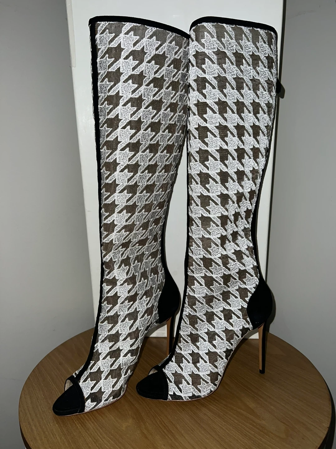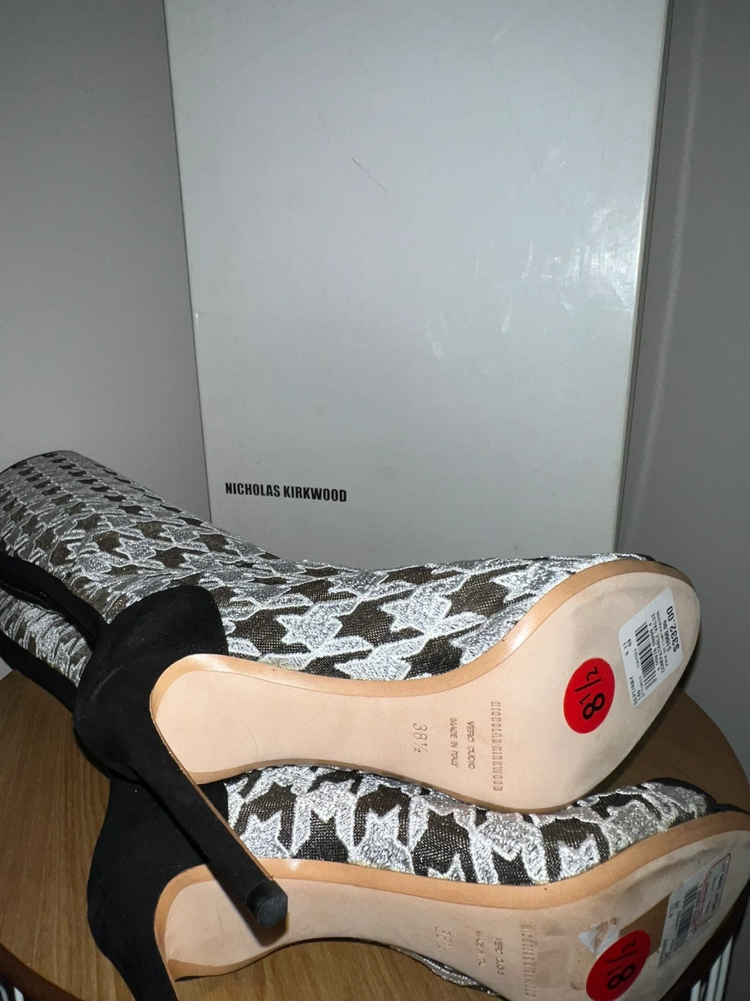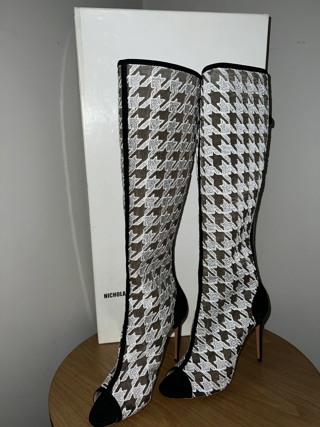 5Selling a pair of Nicholas Kirkwood knee-high boots in a striking houndstooth pattern! These stylish boots are a size 8.5. Fit more like 7.5-8 They come with the original box. Originally priced at 1660$- bought for 330$+taxes