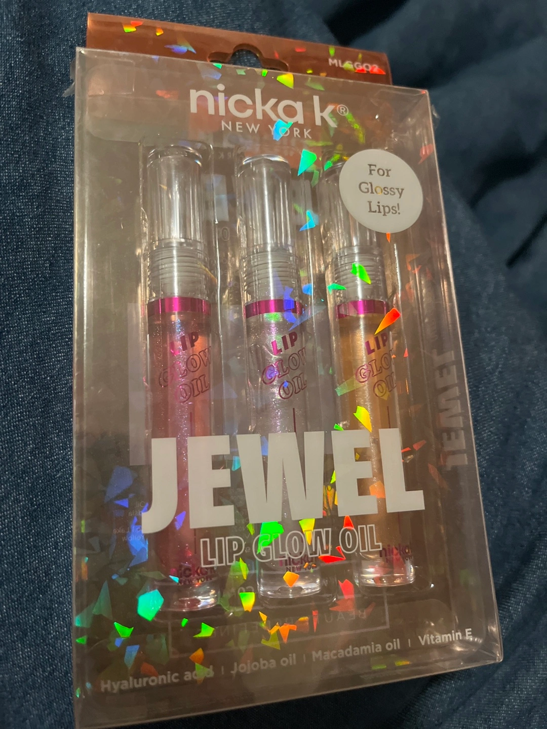 54Three-piece lip gloss set. Contains hyaluronic acid, jojoba oil, macadamia oil, and Vitamin E. For glossy lips.