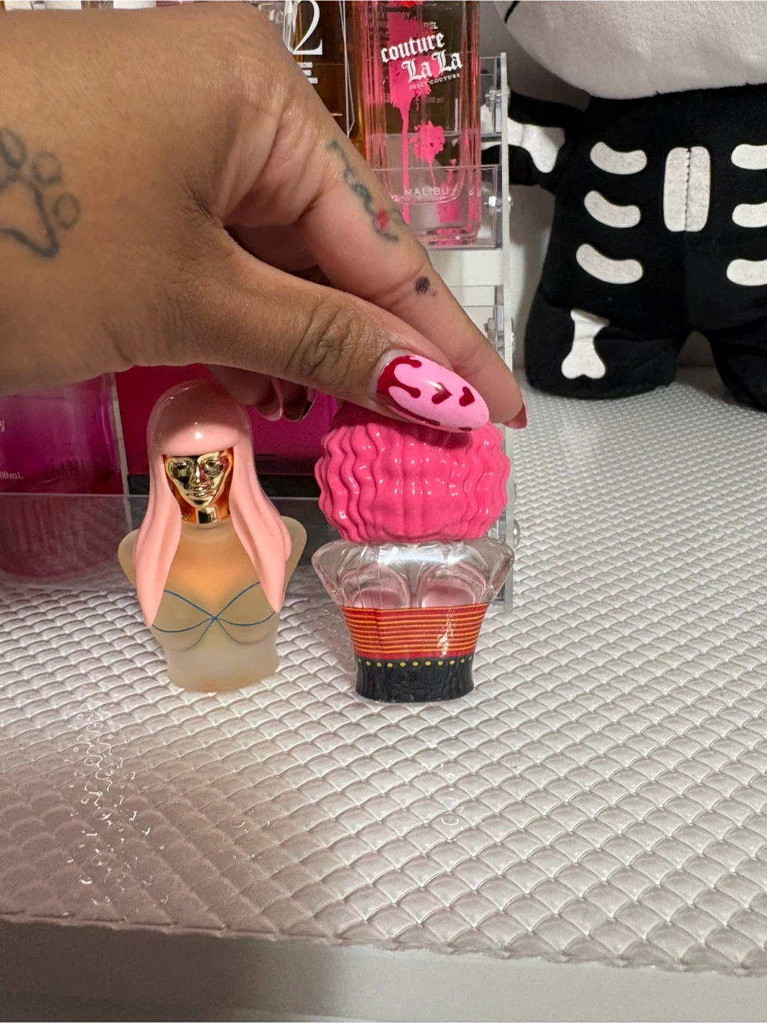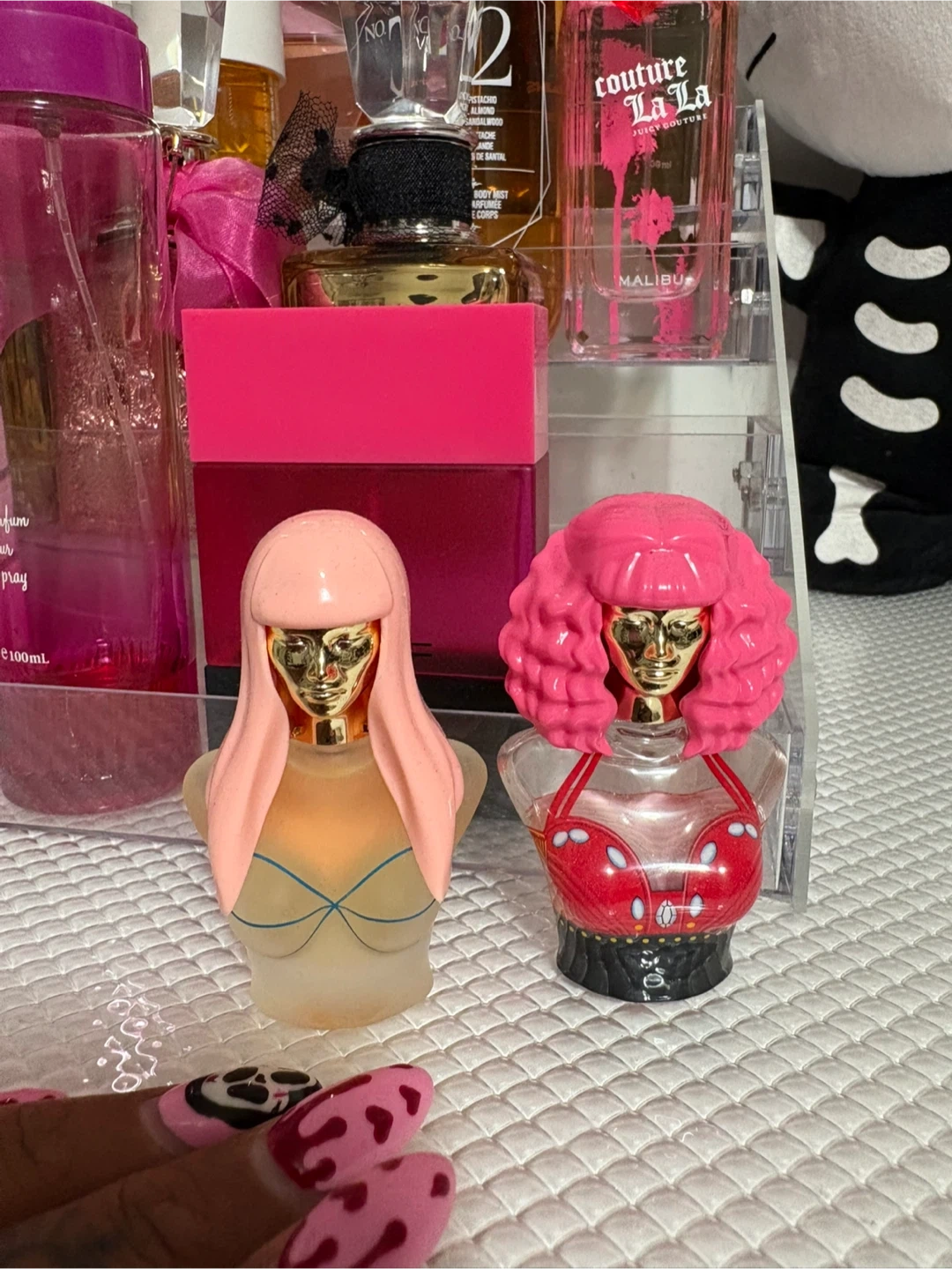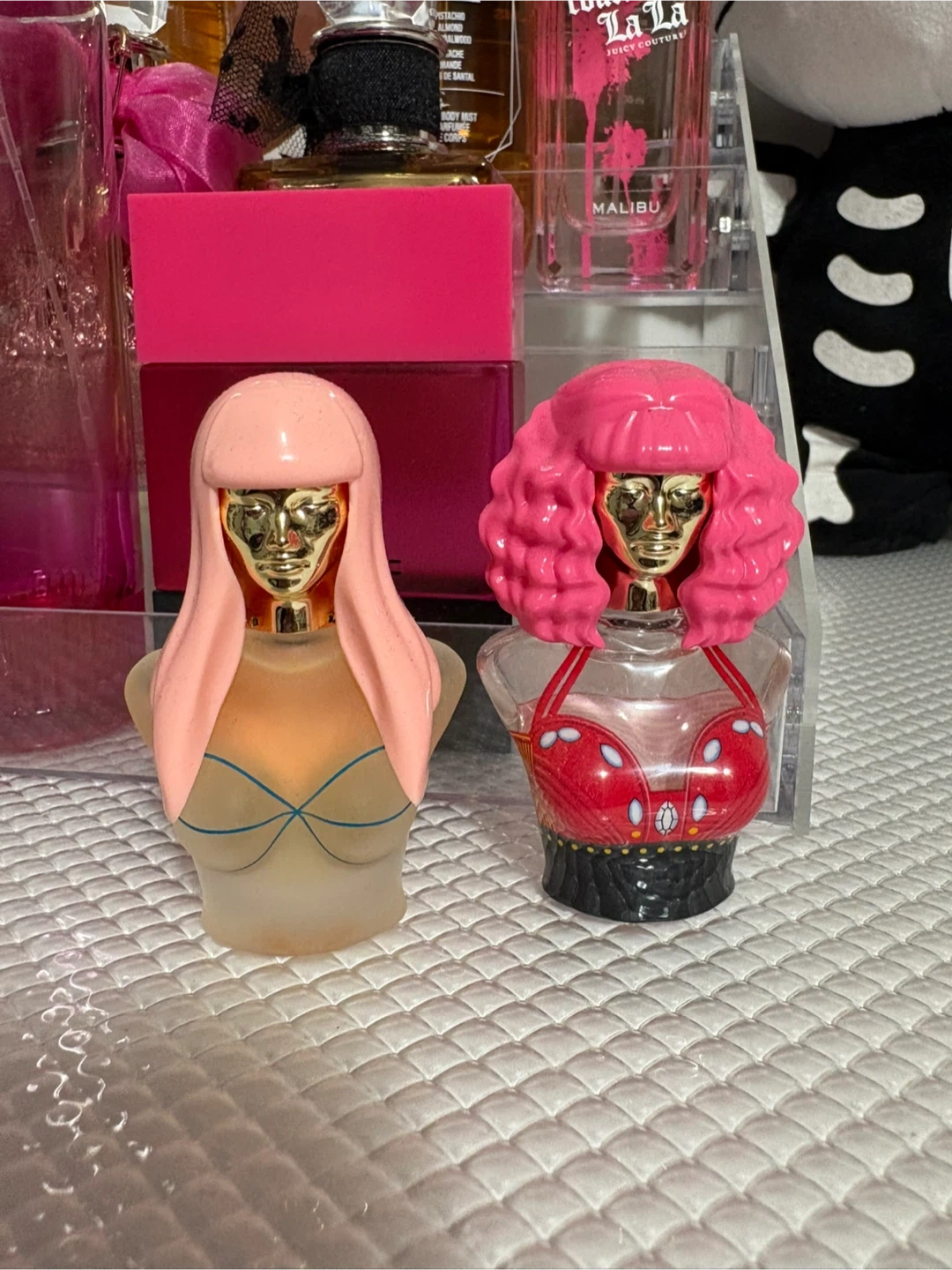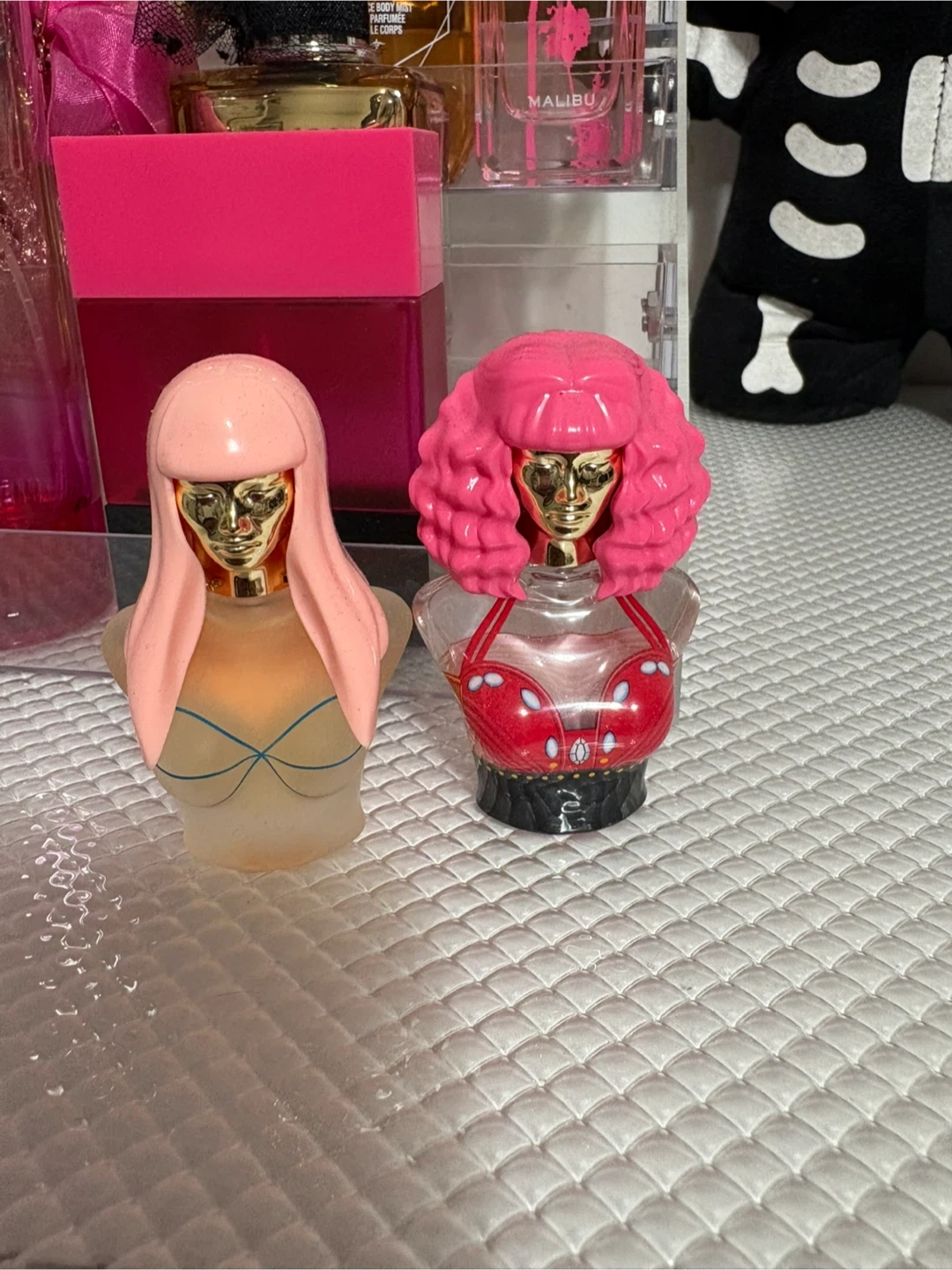 Two adorable Nicki Minaj Pink Friday perfume miniatures! One has straight pink hair and a blue bikini top, while the other has curly pink hair and a red top. Perfect for collectors or fans of Nicki!