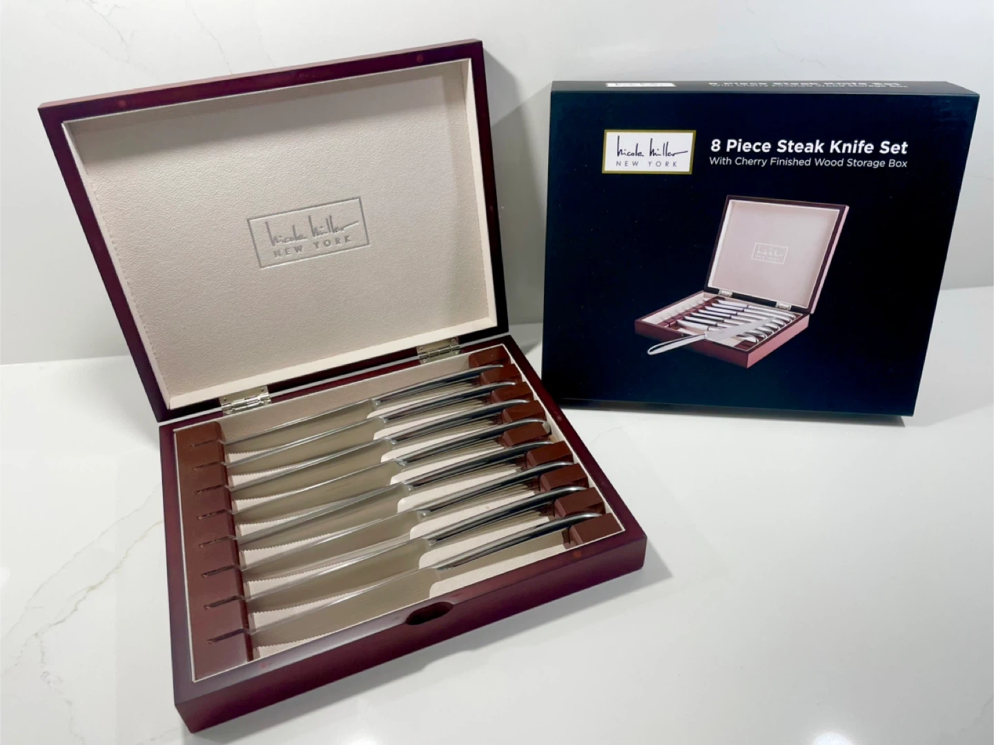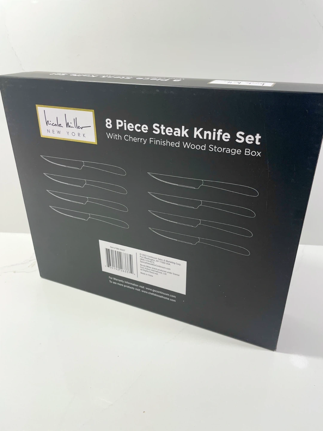 133Nicole Miller 8-Piece Stainless Steel Steak Knife Set w Cherry Wood Storage Box, New $95