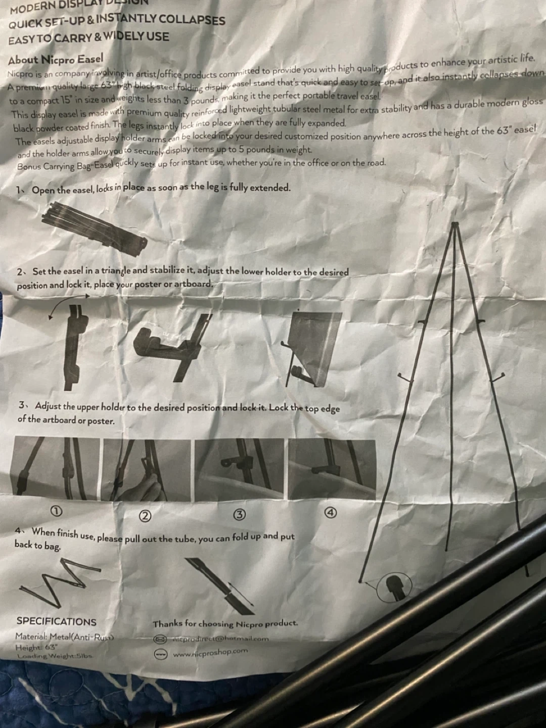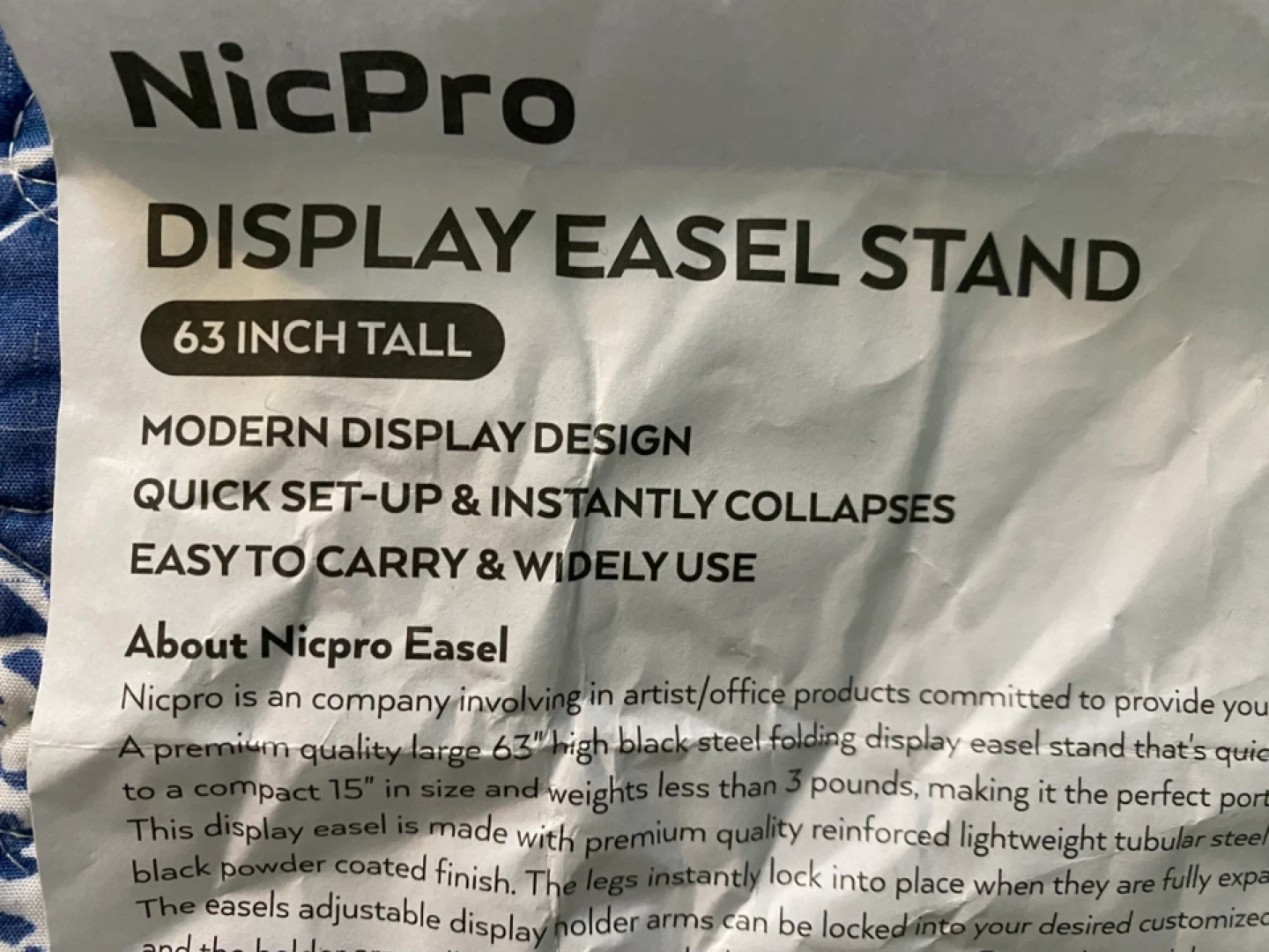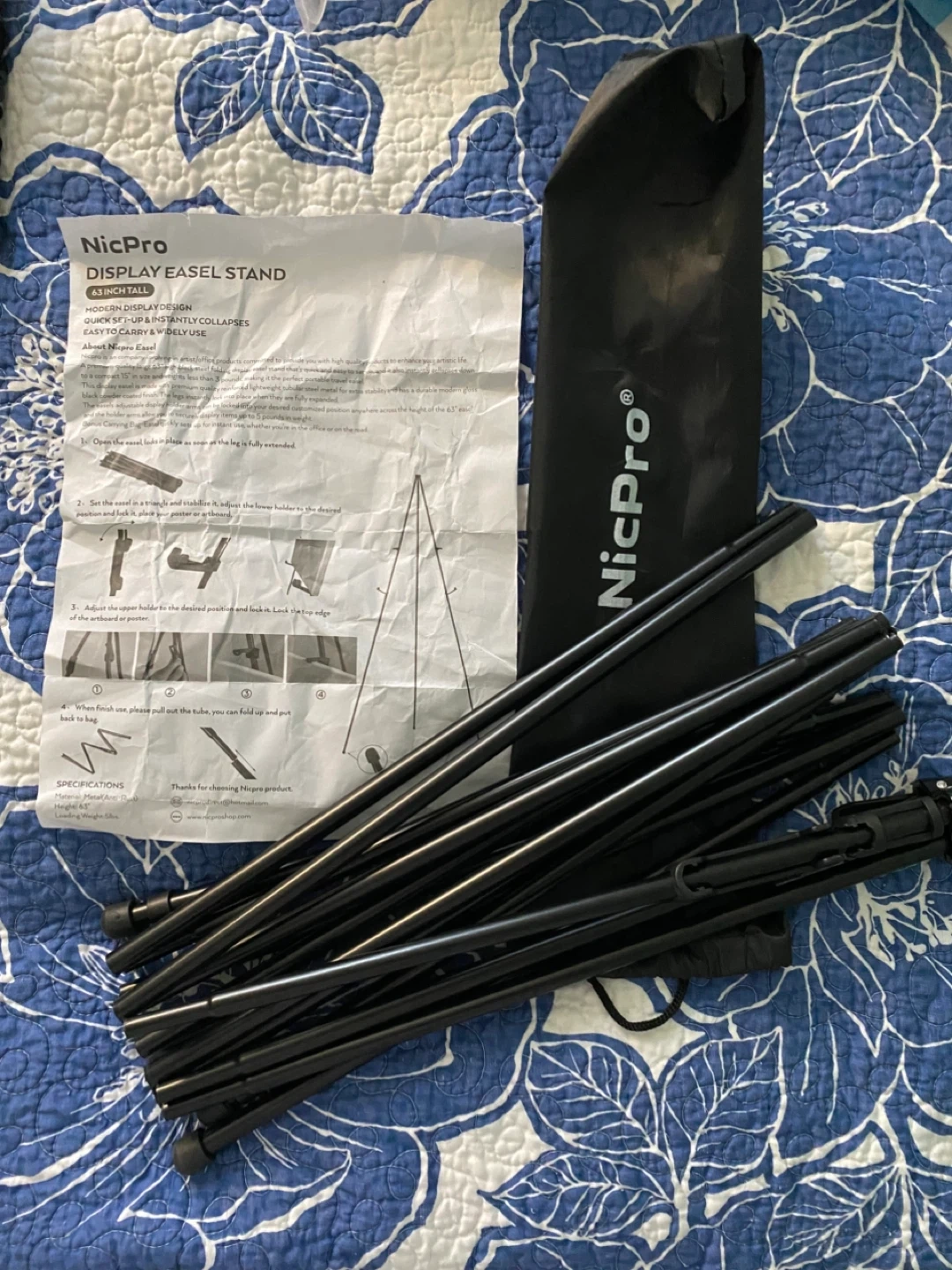 I have 6 in total . 12$ each or all 6 for 50$. NicPro display easel stand that's 63 inches tall! It's lightweight, easy to carry, and sets up quickly. The display easel is made with premium quality reinforced lightweight tubular steel metal for extra stability and has a durable black powder coated finish. It collapses down to a compact 15" in size and weighs less than 3 pounds, making it the perfect portable travel easel