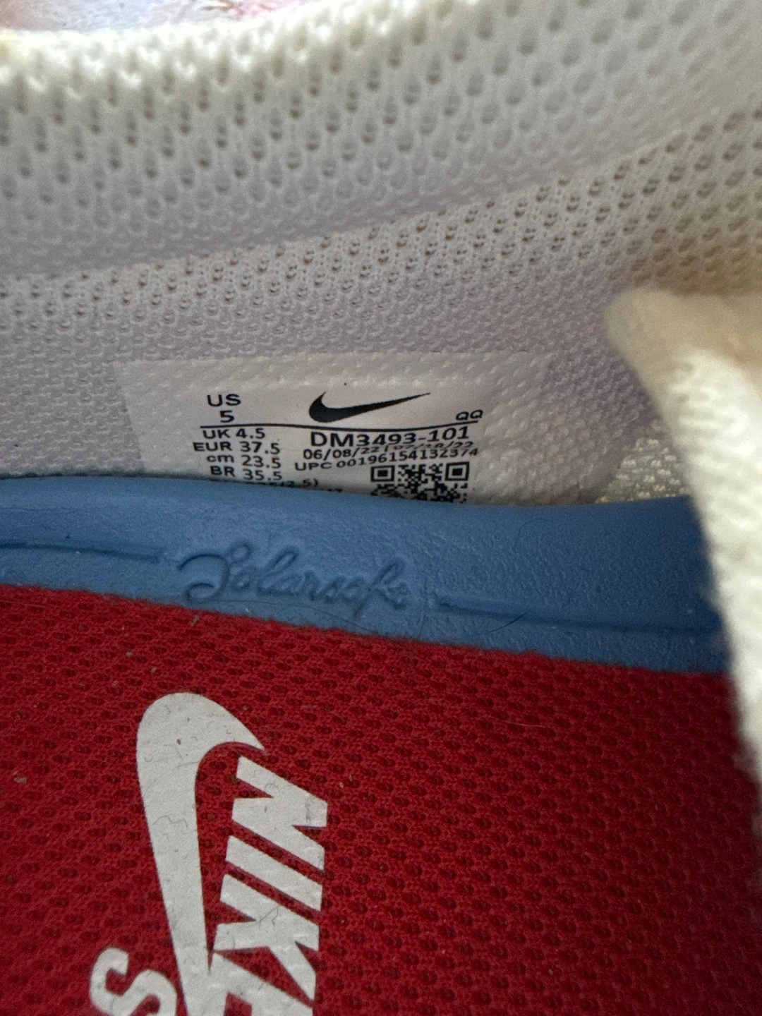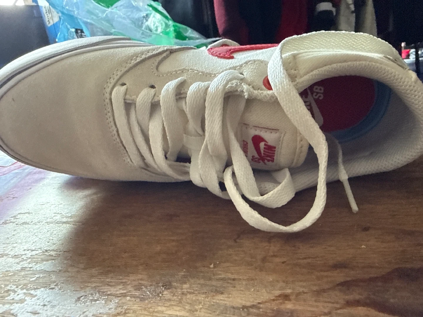 Nike SB skate shoes in off-white canvas with red accents. Features a durable rubber sole. US size 5, UK 4.5, EUR 37.5, CM 23.5.