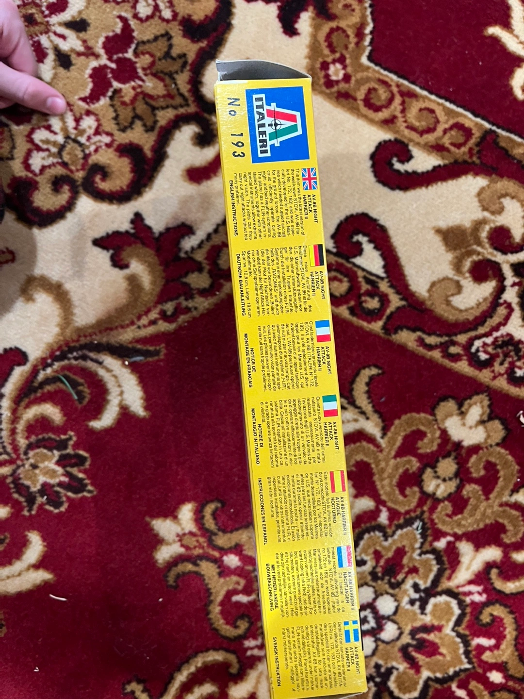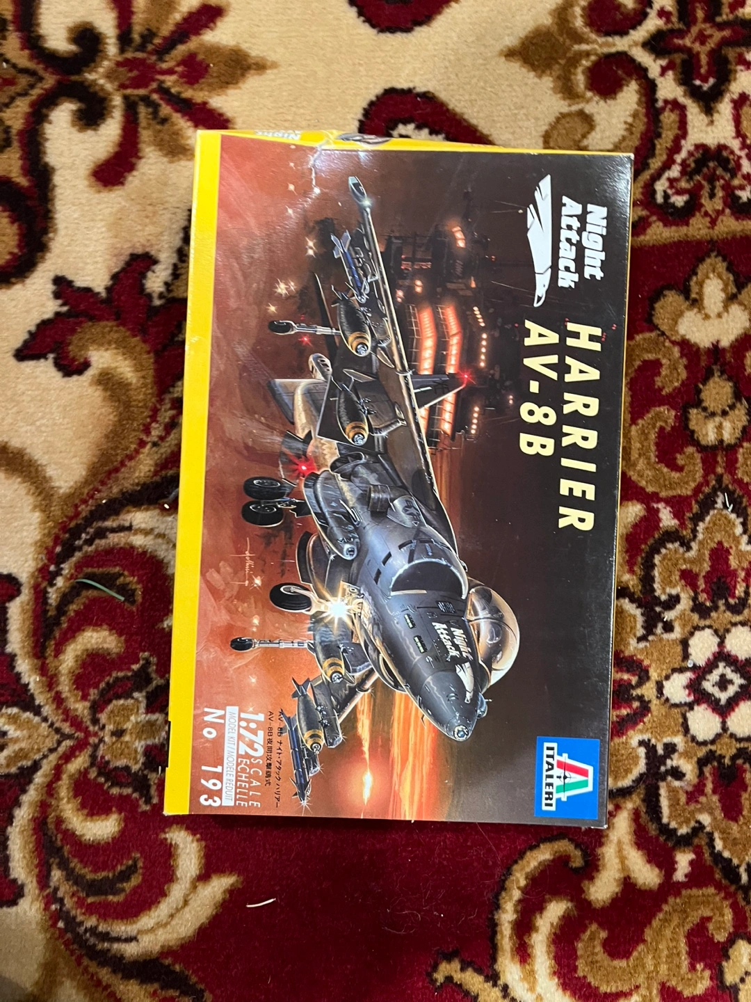 10A model kit of the Night Attack AV-8B Harrier. Included is a box of parts with a detailed image of the aircraft. This model can be a great way to occupy yourself on a rainy day.